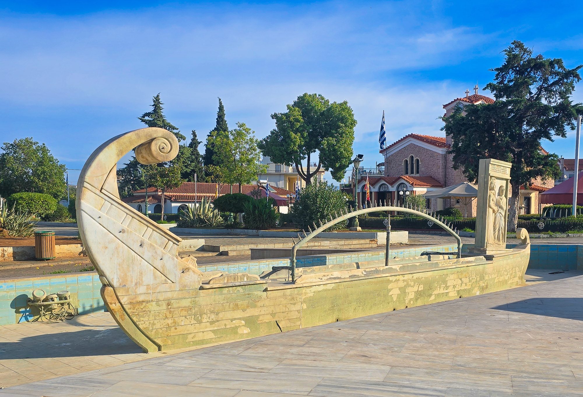 The square at the centre of the village told a moving story. A memorial stood at its heart, a stone fountain in the form of a boat. Not a replica of anything specific, but a stylised interpretation of an ancient Greek galley, all long hull and scrolling prow. The kind of form that suggests passage rather than arrival.