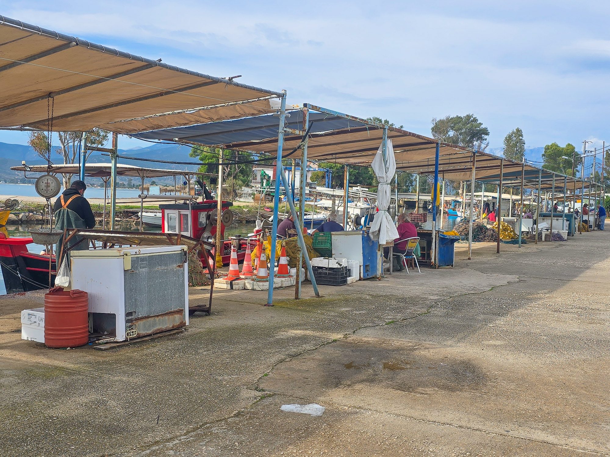 At one end of the harbour, a long row of simple kiosks made from scaffolding poles with awnings lashed to the top was home to a fish market. Each fisherman had their own pitch where they sorted, cleaned and prepared their catch for sale. Plastic crates stacked by type of fish. Weighing scales ready for the next customer. I did not count the stalls, but there must have been space for twenty, maybe more. This was where people came to buy fish. Properly.