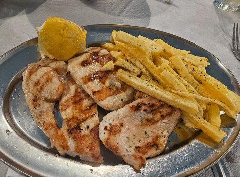 Once unpacked and changed, I head out for something to eat. At the top of the steps and to the right is Liotrivi Fish Taverna. The terrace of the taverna is above my room and I can hear the chatter of voices and clinking of glasses before I leave.