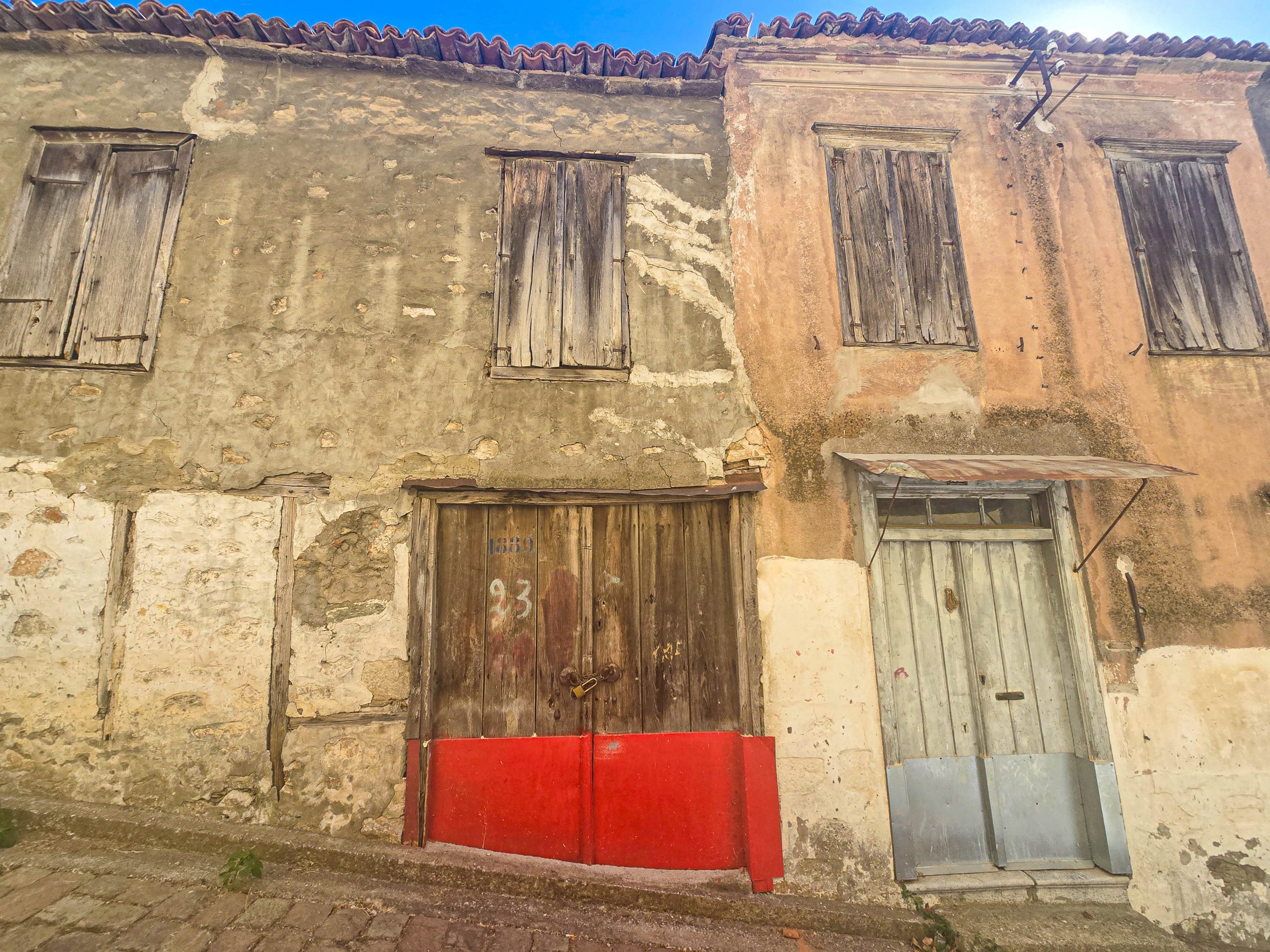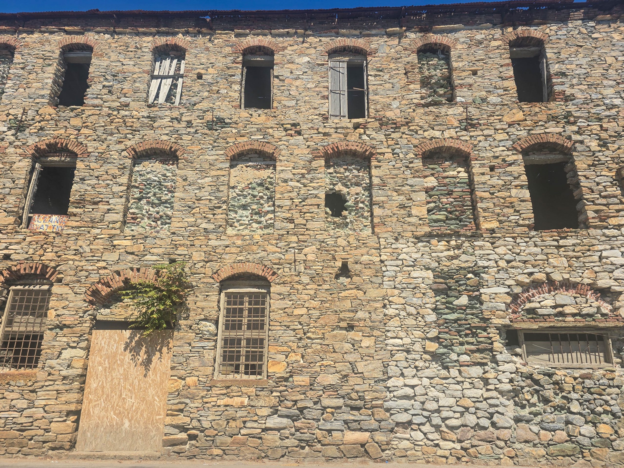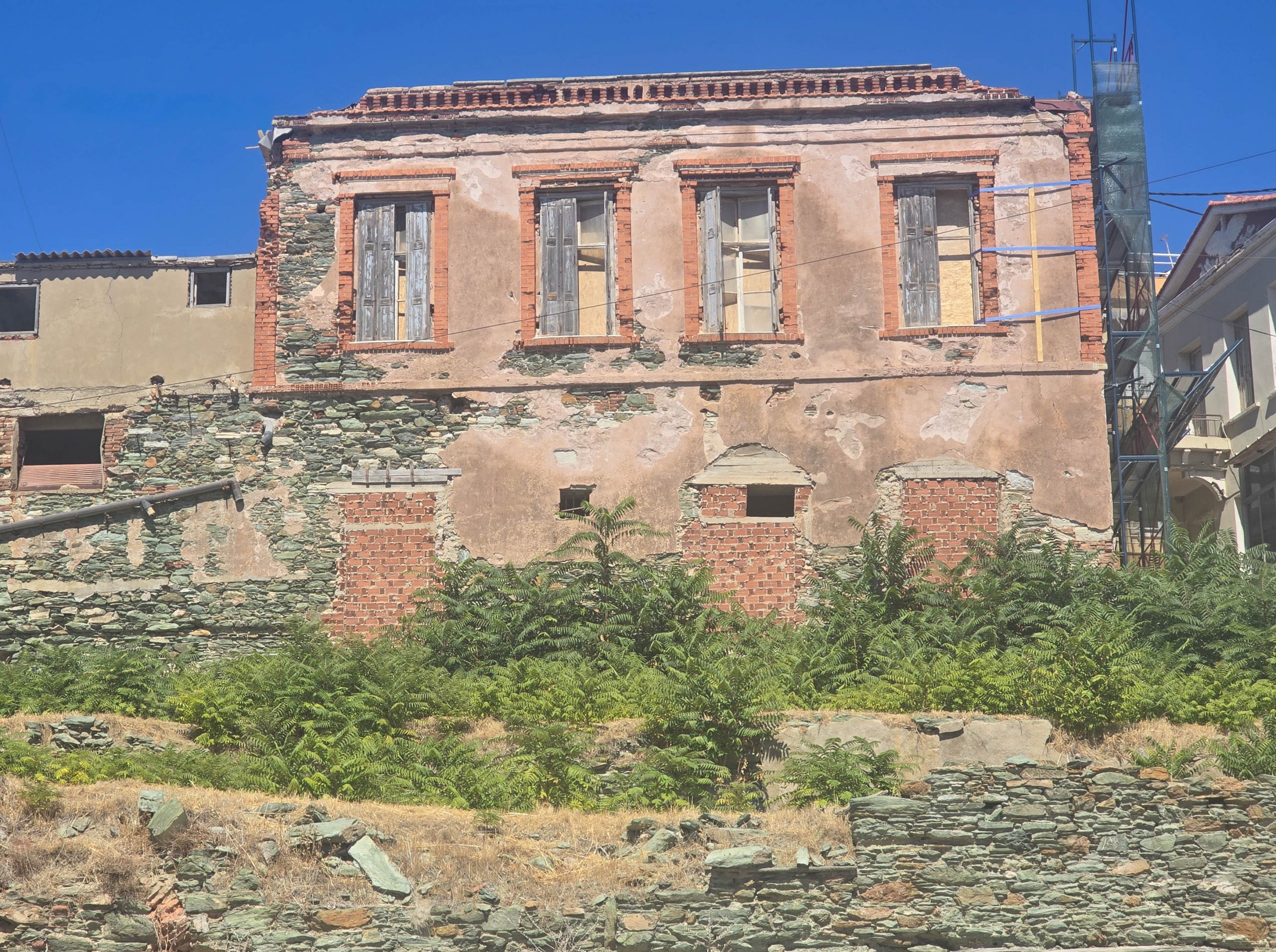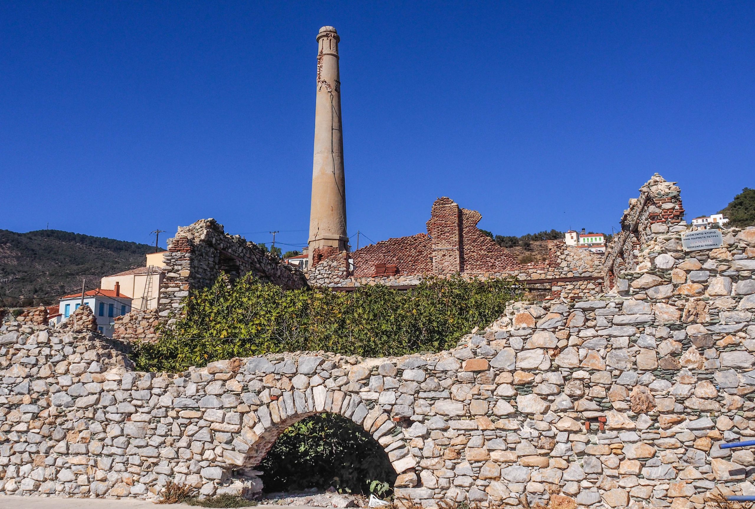 From the museum we wandered into town, walking past golden stretches of sand and some striking but dilapidated industrial buildings along the seafront. One large structure in particular, resembling an old mill, has always piqued my curiosity. Plomari isn’t just famous for its ouzo production. It has a rich shipbuilding and naval tradition, and its shipyards were at one time the most significant in the Aegean. The large stone building on Plomari’s seafront was part of the town’s old industrial waterfront and is linked to the Xypteras factory. It was associated with the processing of olive products, most likely olive oil and soap, drawing on the island’s vast olive groves and easy access to maritime routes. Designed for function rather than appearance, buildings like this once played a central role in the town’s economy before falling into decline. It was later purchased with the intention of housing a maritime and shipbuilding museum that wanted to preserve Plomari’s working past, but as of yet, that vision has yet to be realised.
