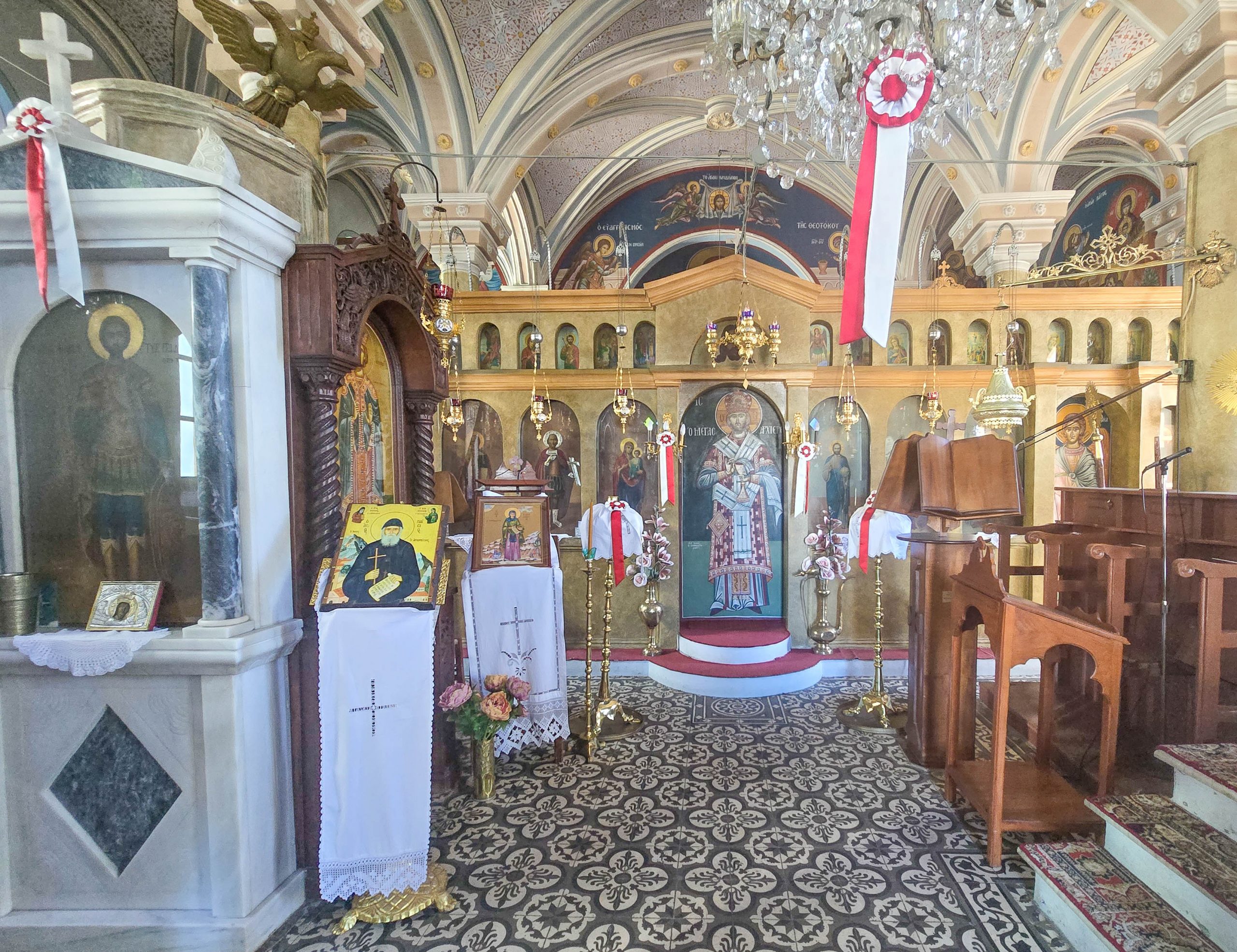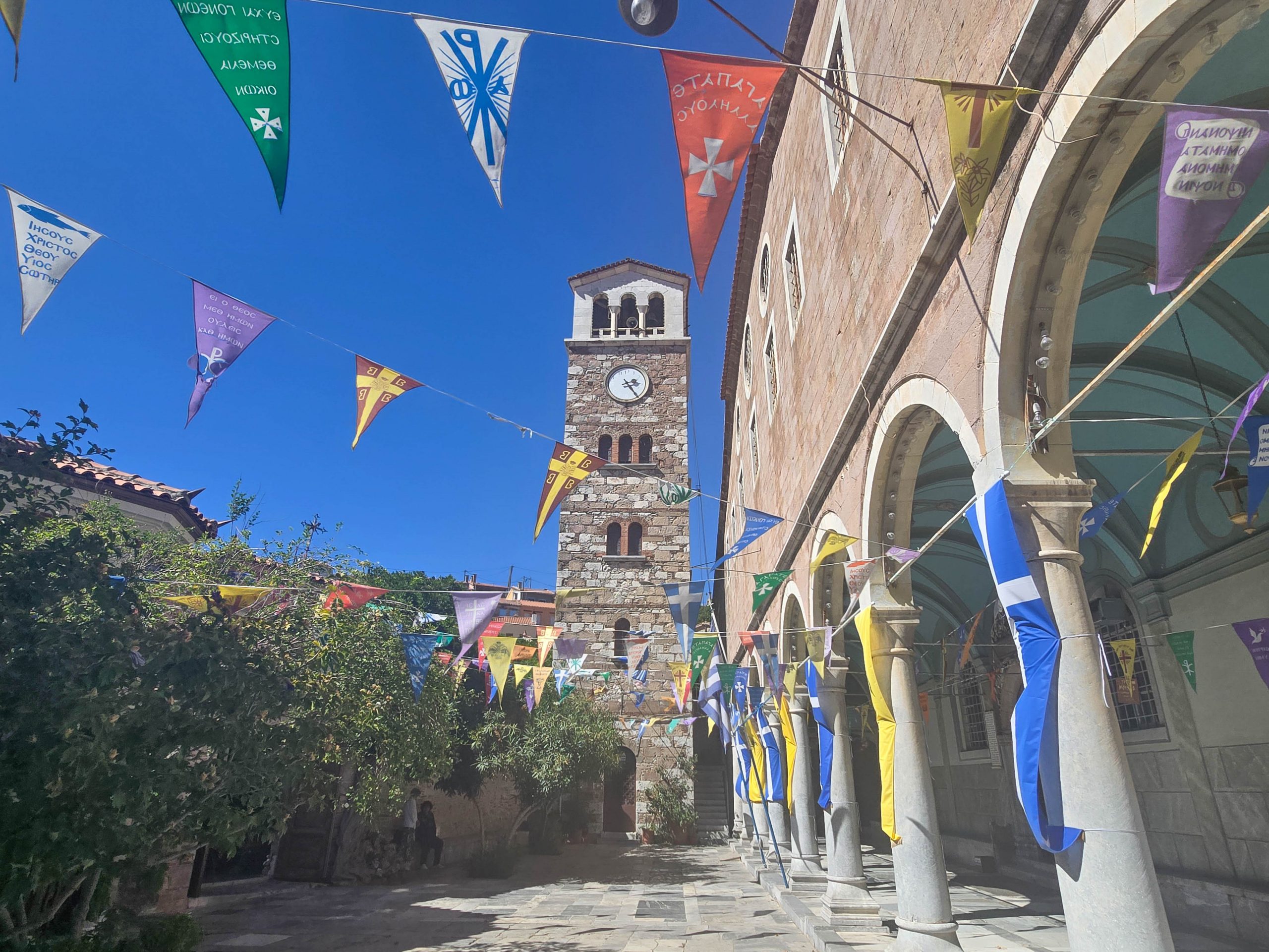We reached the main square and passed through a large door into a courtyard, where the village’s Church of Panagia sat in all its glory, decorated with brightly coloured bunting. The Church is one of the most important pilgrimage sites on Lesvos, built around a revered icon of the Virgin Mary, believed to date back to the Byzantine period. The church has long shaped the religious and cultural life of the village, drawing worshippers from across the island, particularly during major feast days when Agiasos fills with visitors. The interior was magnificent, although photography wasn’t permitted inside.