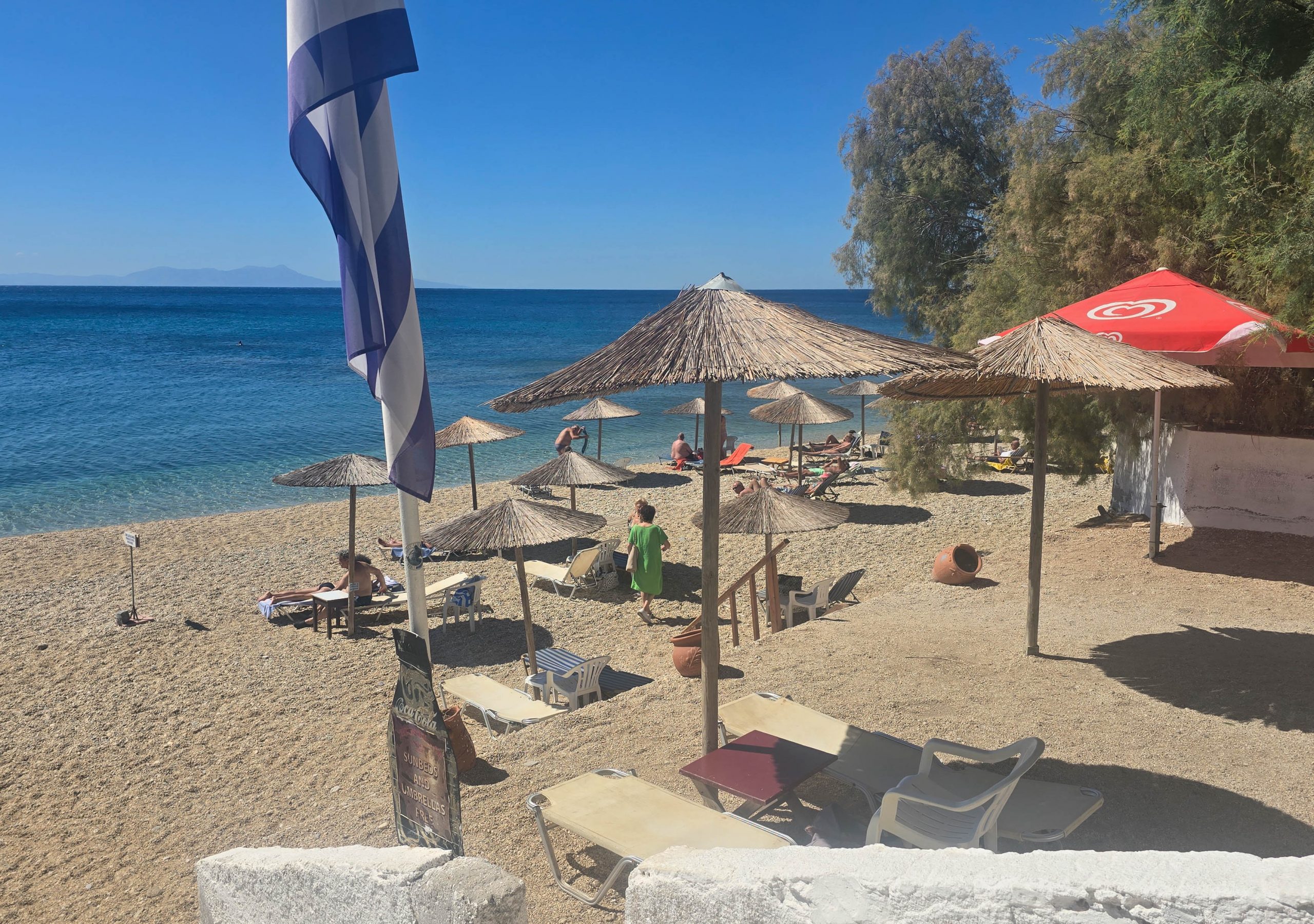 The bus was on time, and soon we were rolling through thick swathes of olive groves, the landscape opening out in a way that always reminds me just how fertile Lesvos is. I’d learned from a previous visit to ask the bus driver for a request stop near the distillery rather than riding all the way into town and trudging back uphill. A small group of visiting Greeks requested a stop at the small hamlet of Agios Isidoros, located just before the distillery, so we jumped off with them. The small church of Agios Isidoros sits above the beach that takes its name. The beach is one of the island’s most popular swimming spots, combining clear water with easy access from town.