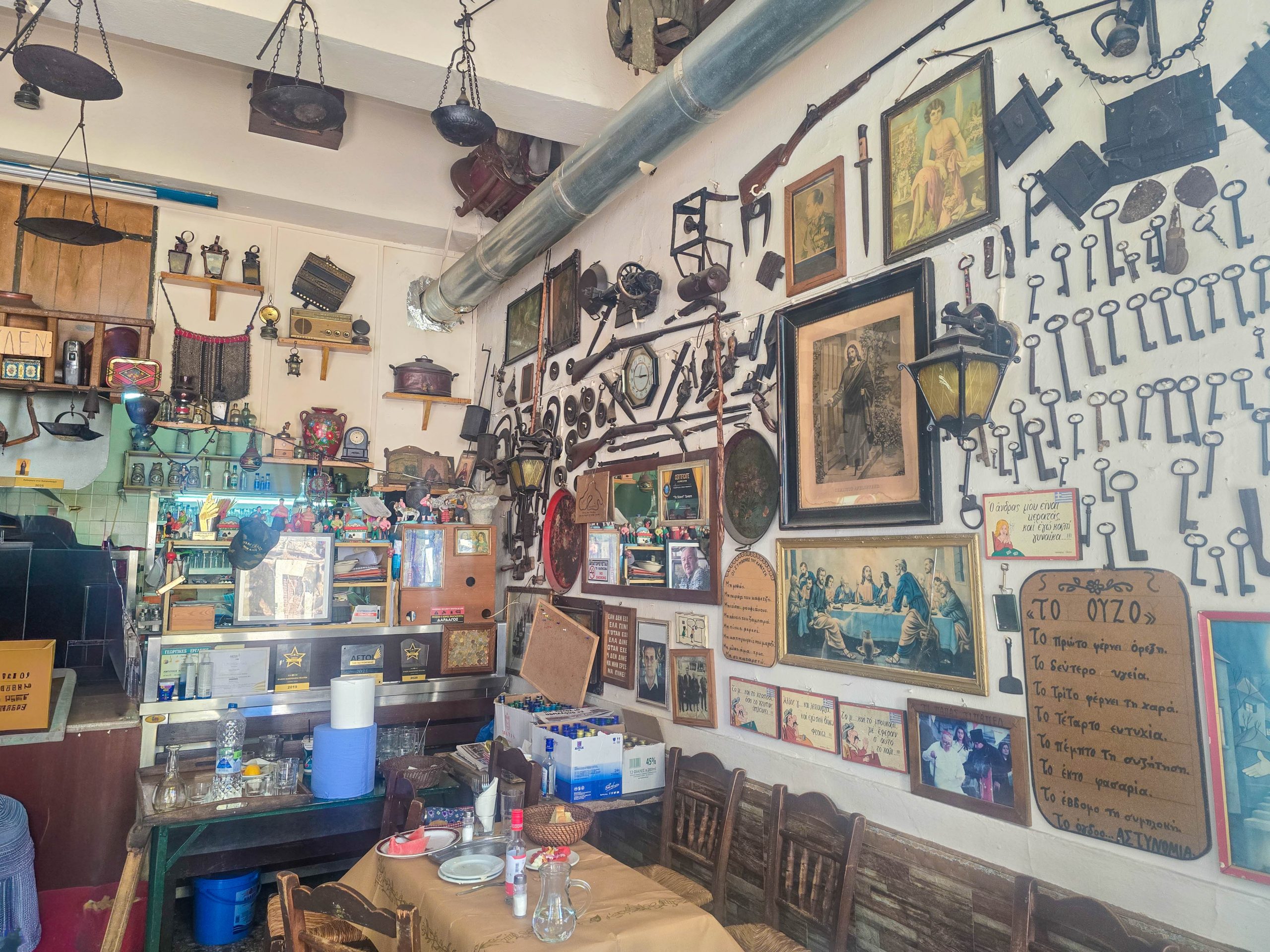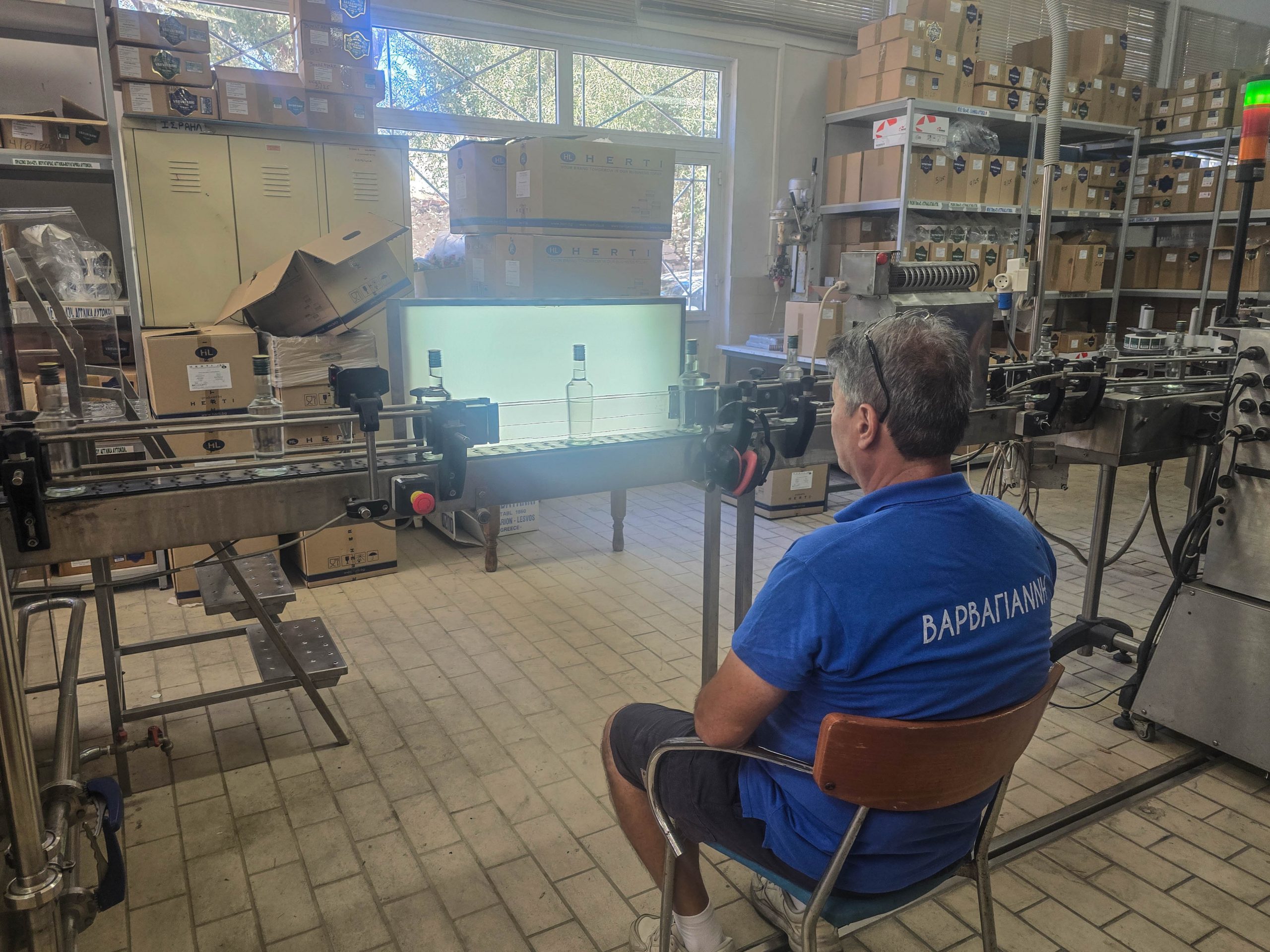 Just a few minutes walk from the beach is the Barbayanni Ouzo Museum. A coach party had just arrived, but we were invited to join them straight into the factory before returning to the museum itself. Inside, ouzo production was in full swing, and it was oddly mesmerising with its Willy Wonka-like production line. Bottles moved along conveyor belts, filled, capped and labelled with rhythmic efficiency. Despite the machinery, quality control still came down to a man sitting on a chair, scrutinising every bottle as it passed. Anything that didn’t meet his standard was removed without hesitation. Hmmm – I could do that job!