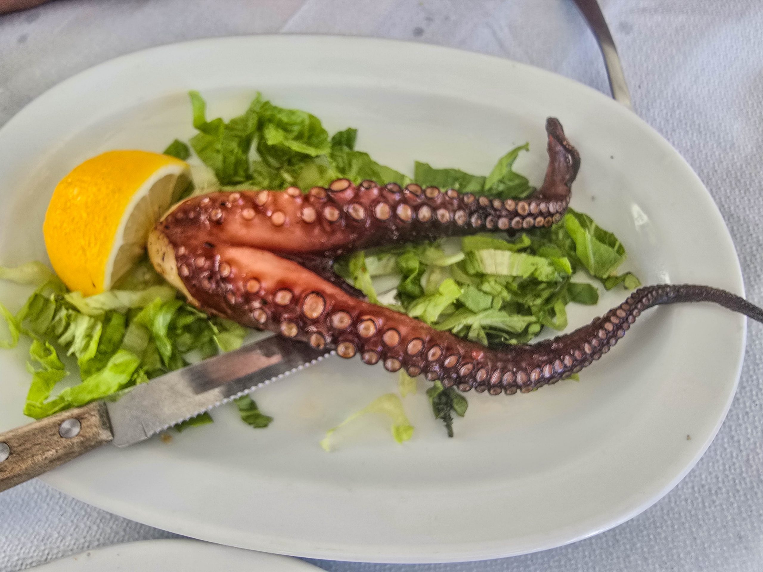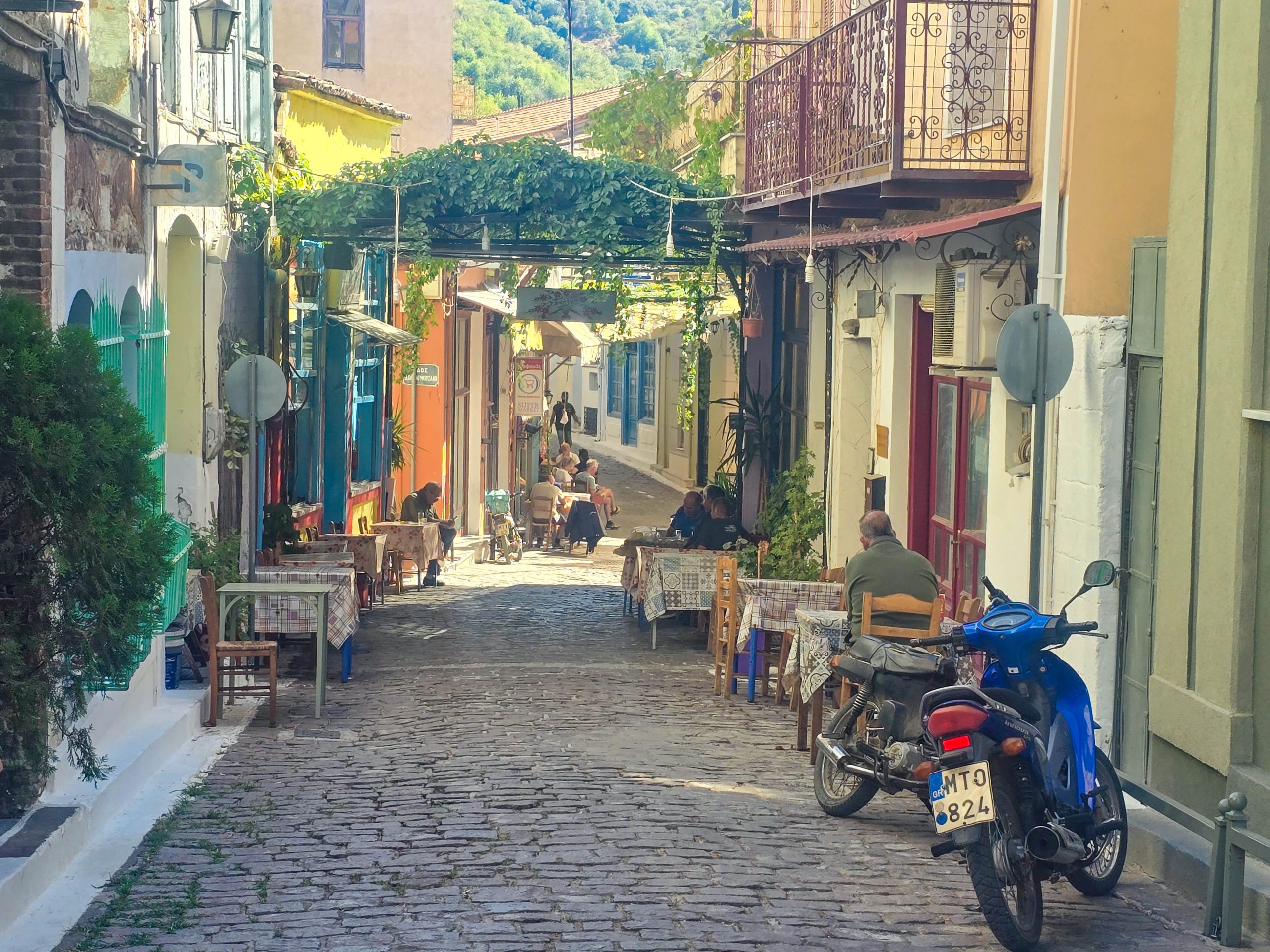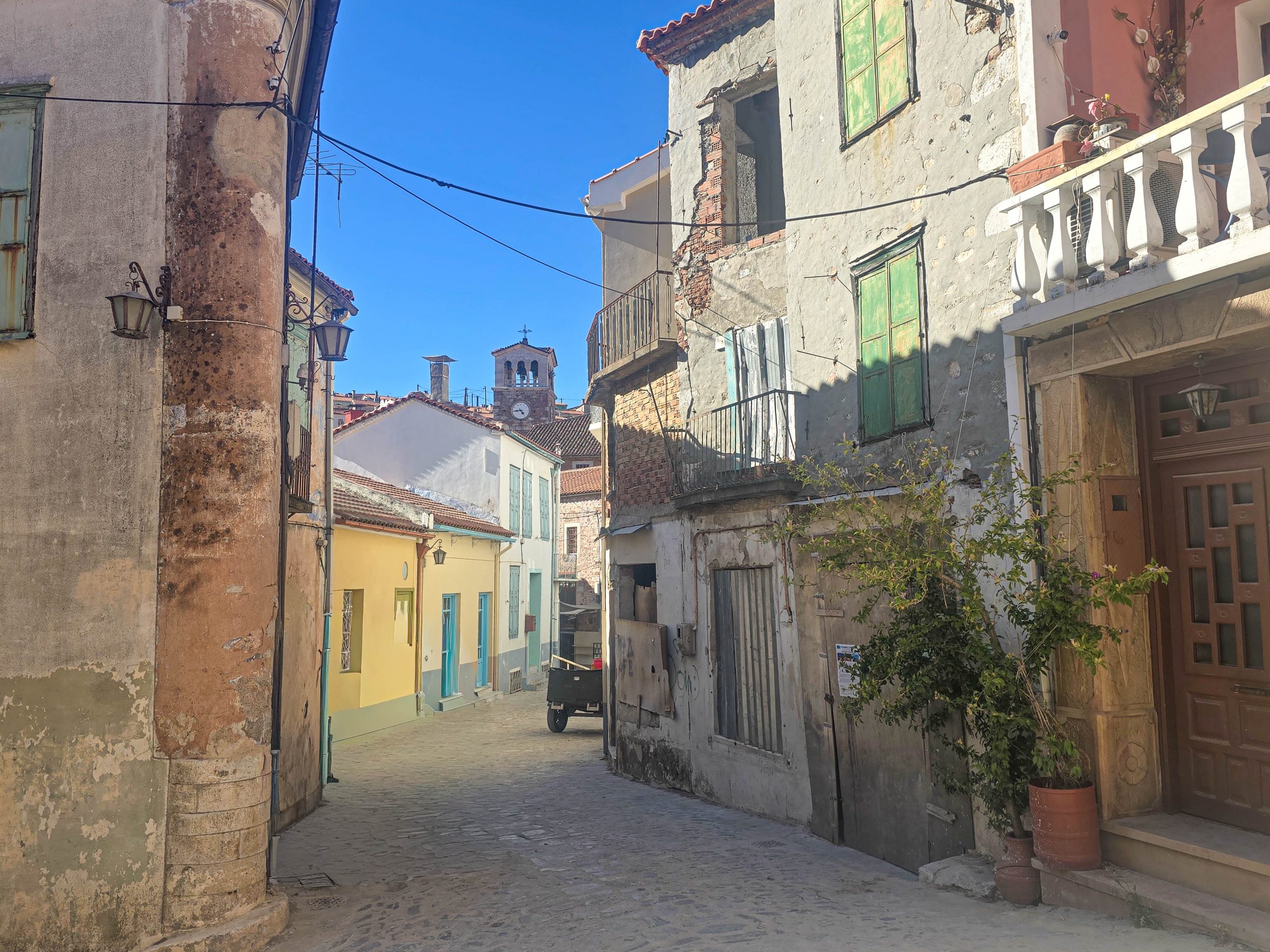 Now feeling a little weary, we stopped at Taverna Apolafsi on the harbour’s edge for lunch. Unfortunately, our timing coincided with the arrival of another coach party and the wait — and the food — didn’t quite live up to expectations. It’s fair to say that I was feeling the weight of yesterday’s travel, a touch of fatigue and perhaps the after-effects of the ouzo tasting, so we sucked it up and put it down to experience. We took a slow amble around the cobbled streets until it was time to catch the bus back to Mytilene. The rest of the day was written off in the best possible way – rest, sleep and a quiet evening. We determined to grab tomorrow by the horns.
