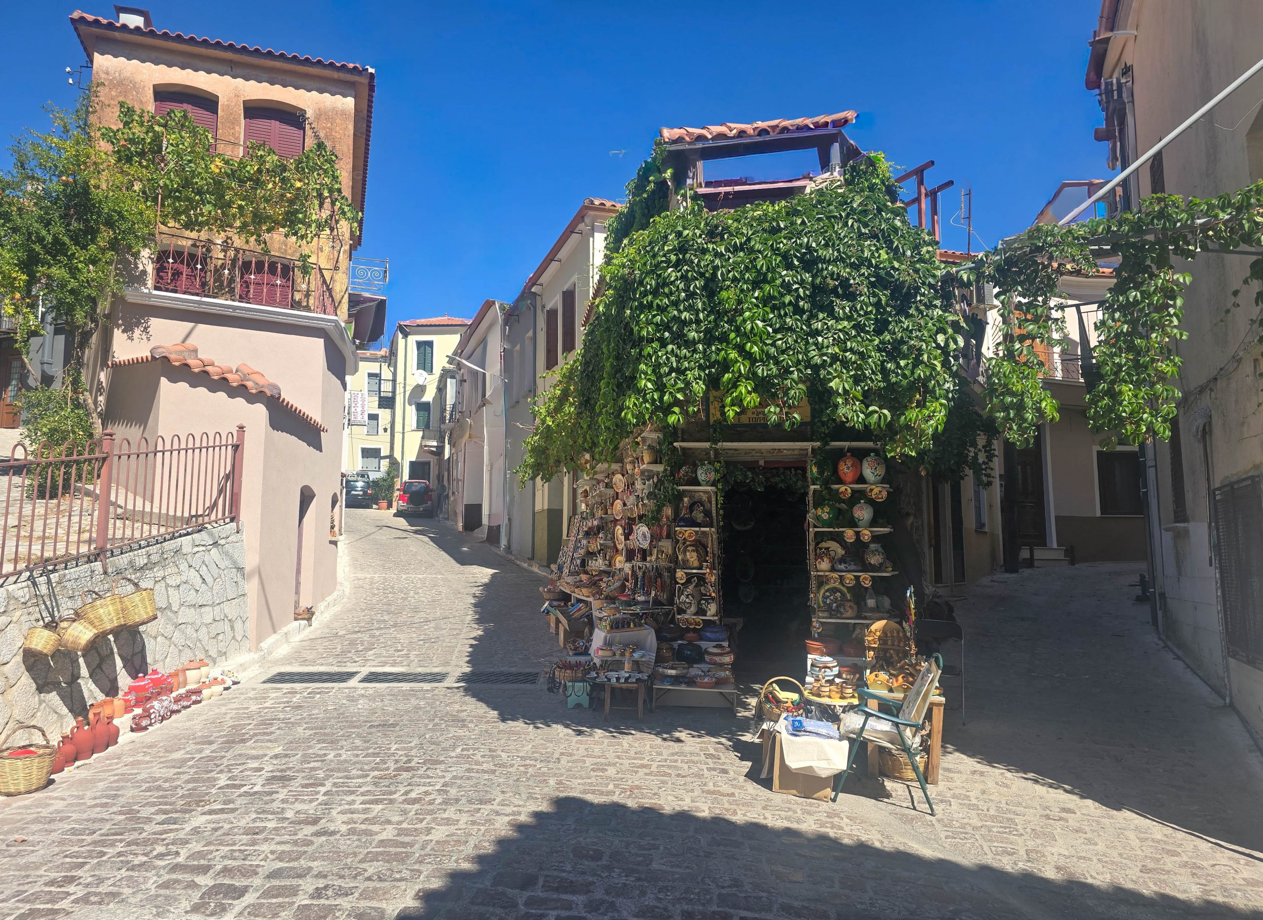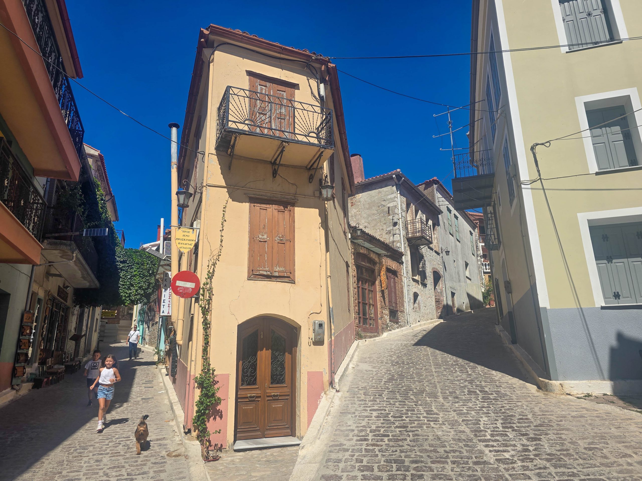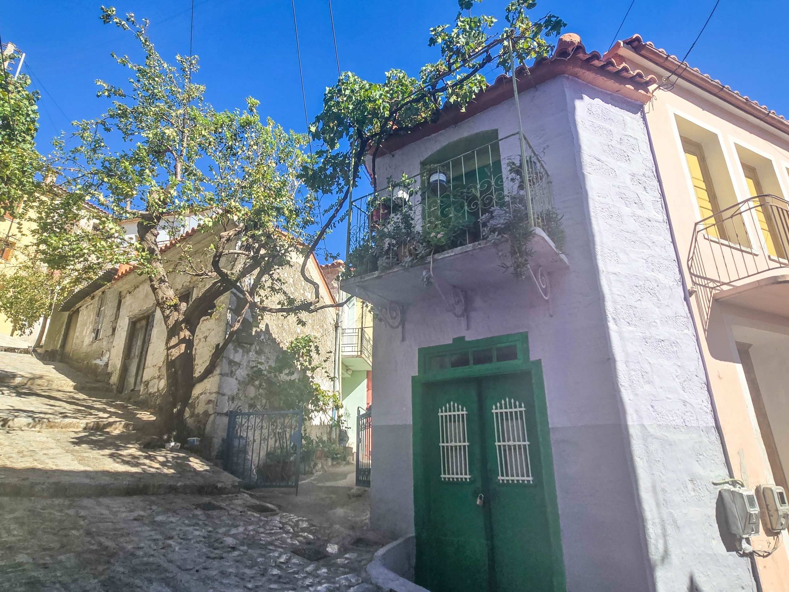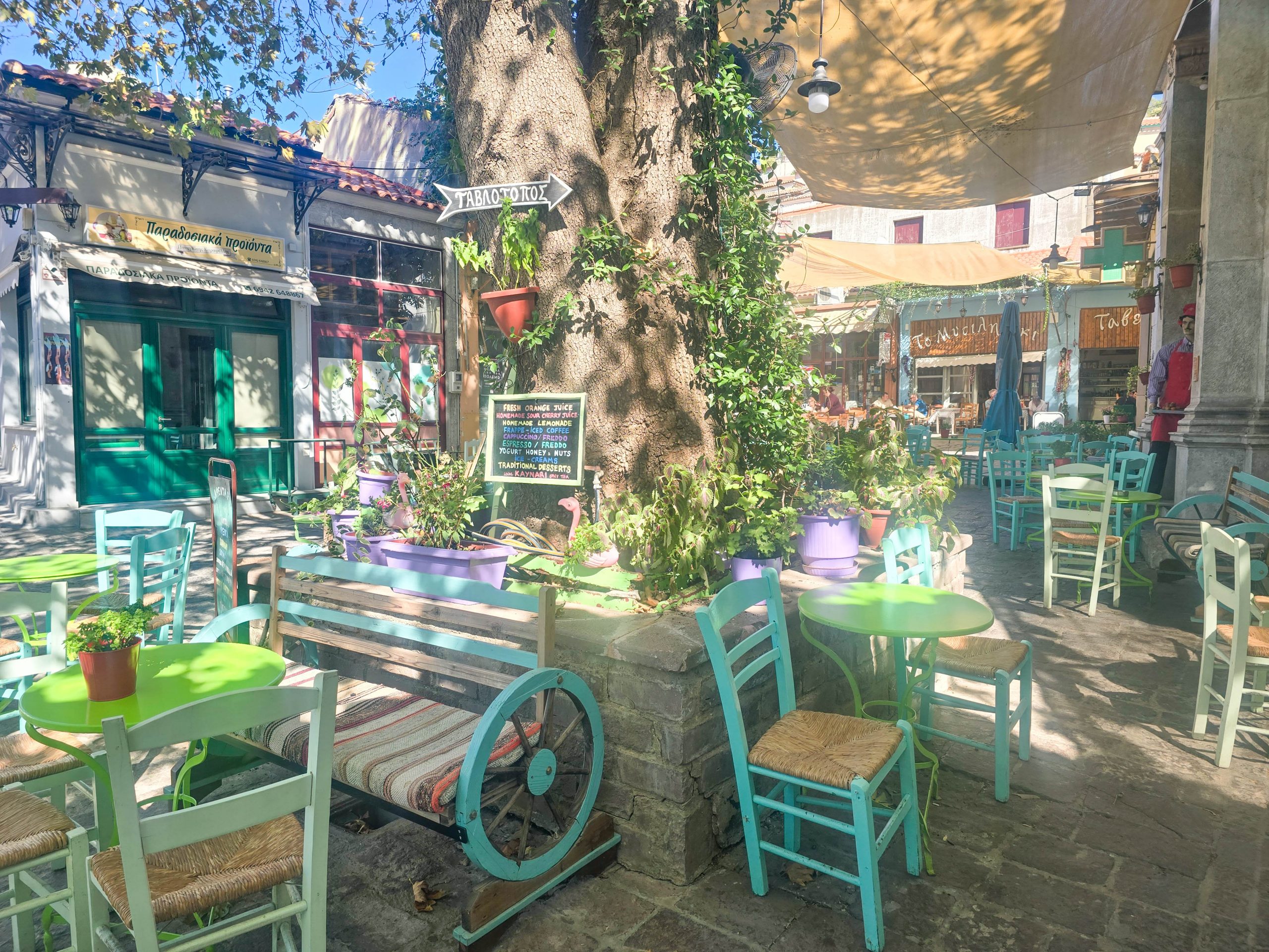 Away from the seafront, Plomari reveals itself as a proper village, with steep streets winding their way uphill and houses stacked tightly into the slope. Many are built in pale stone or painted in soft, sun-faded colours, with balconies that seem to hover over the lanes below. Small cafés and ouzeries appear almost by chance as you wander, often tucked into corners or shaded by trees, and they feel geared towards everyday life as well as passing visitors. There’s a sense that people still use the village spaces as they always have — stopping for coffee, greeting neighbours, sitting outside in the shade — it’s utterly charming.