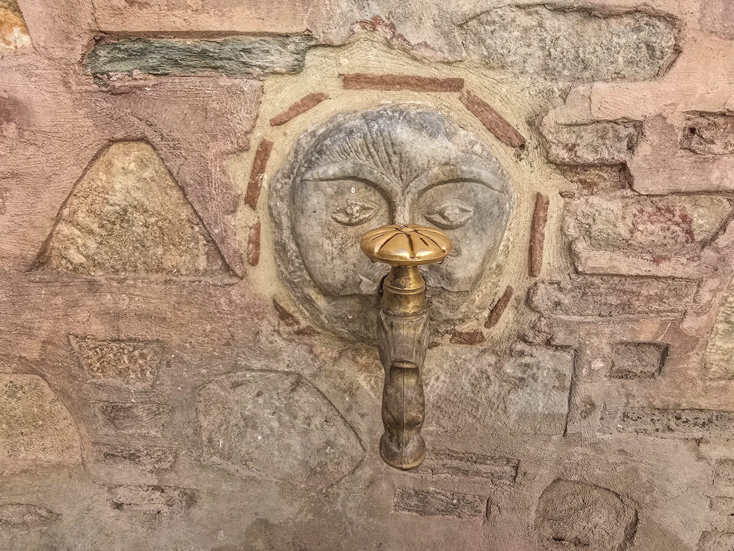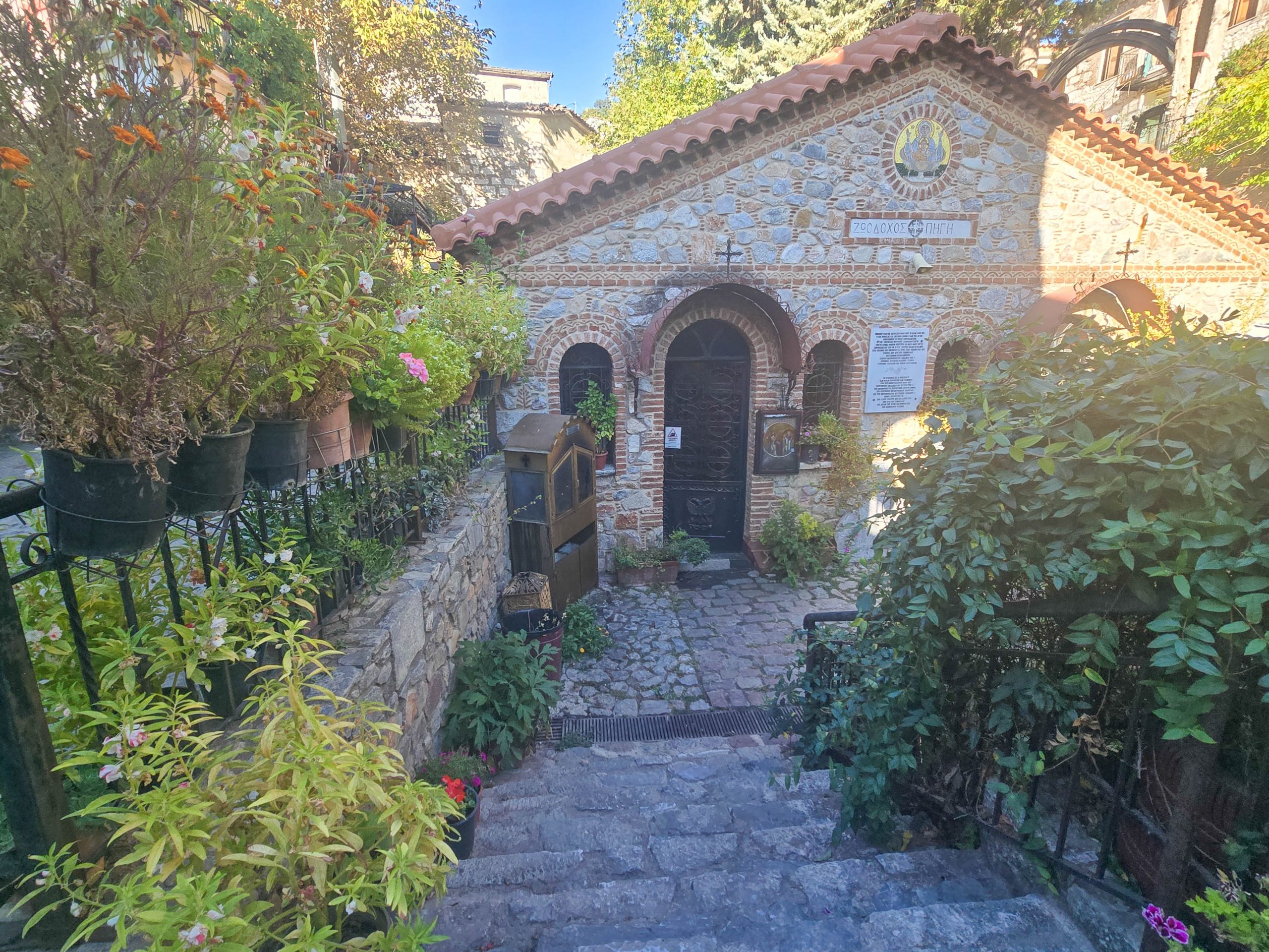 Still with a bit of time to kill, we slowly made our way back to the entrance of the village, taking a short detour to the tiny church of Zoodochos Pigi. This small chapel sits in a carefully kept garden and is dedicated to the Life-Giving Spring, linked to water and fertility. At the centre of the carefully tended garden is a simple stone fountain with a metal spout. This is likely the remnant of an earlier spring or water source, which would neatly explain both the chapel’s dedication to the Life-Giving Spring and its setting outside the village core.