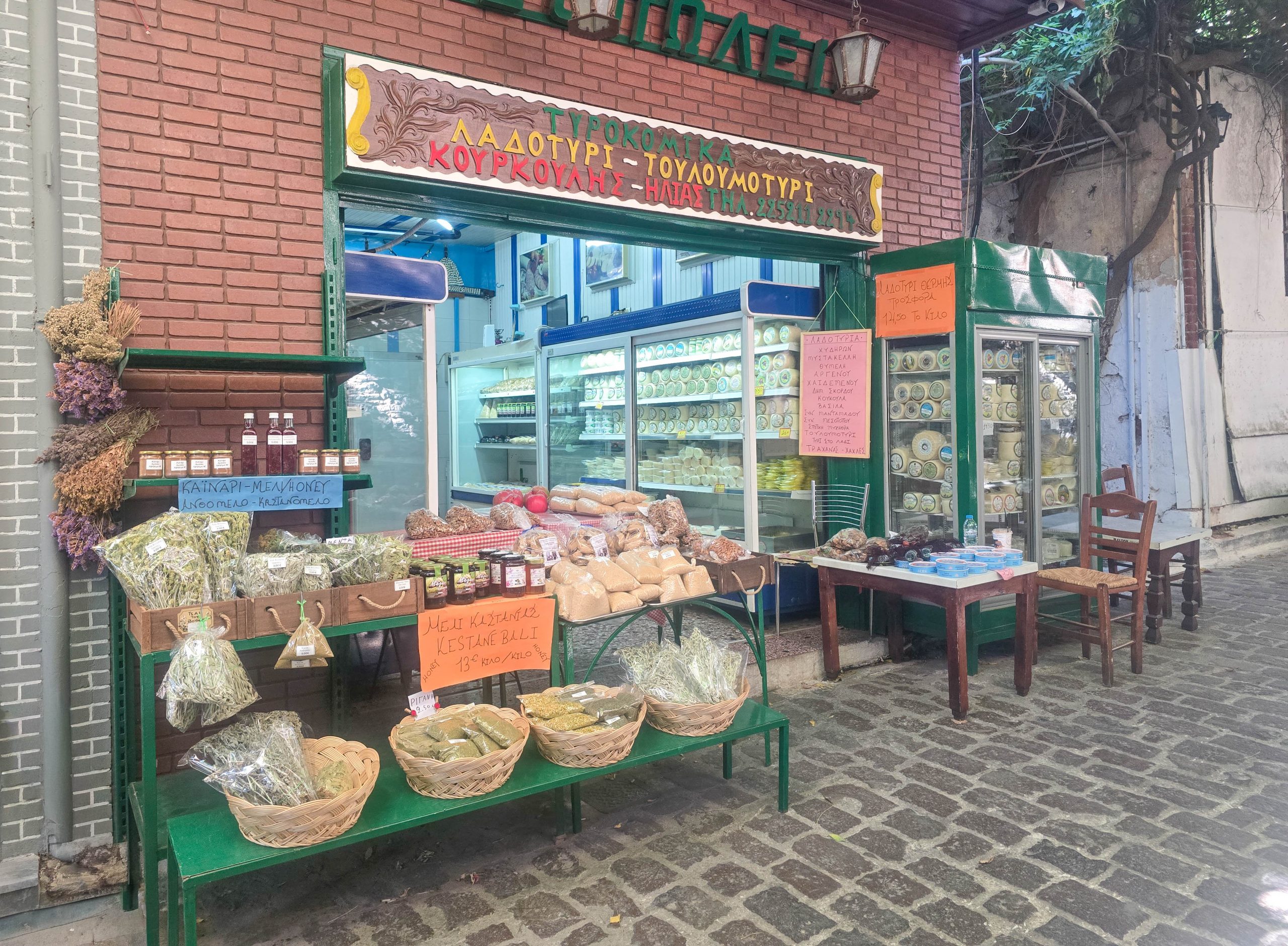 Before leaving Agiasos, we stopped at the bakery Sousamli of Agiasos, to buy some ‘vasilopita’, a cake famously consumed at New Year. Even though the new year was three months away, this rich, dense cake is sold here at any time of the year. This local version is made with trachana, a dried, fermented wheat mixed with goat’s milk, which gives it a dense, slightly granular texture and a depth of flavour you don’t get in the usual sponge-style cake. Lightly sweetened and closer to bread than dessert, it’s very much a village bake. With our tasty purchase in our hot little hands, we had one final wander around the streets and the hidden gems around every corner.