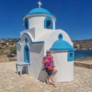 We set off along the harbour front and follow the road to the left at a small church. All starts off well with Peter as my navigator giving me directions on Google Maps (though TBH his sense of direction is as diabolical as mine!). Our first destination is the Church of Panagia Charou (Virgin Mary of Death). The church is one of the oldest on the islands, built in the early 1600’s by monks from the monasteries of neighbouring Patmos. Inside the church, the icon of Mary is unusual in that Mary is holding a wooden cross with a crucified Jesus on it and not as she is usually portrayed, with babe in arms. Inside the church there are several people paying their respects to the icon so we don’t linger.
