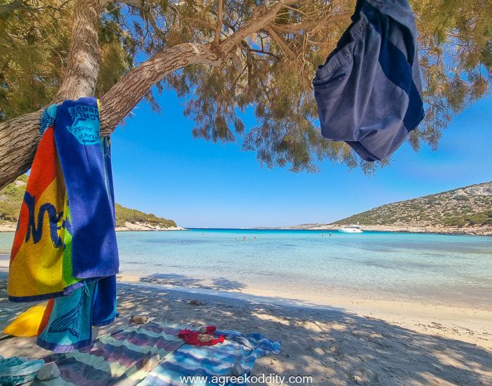 During this period of high temperatures, shade is absolutely crucial so we ensured that we were at the taxi rank by 8.30 in the morning. We waited about ten minutes for a taxi and ten minutes later we were at Platis Gialos Beach. We arrived in plenty of time to stake a place under a tree, pre-empting the trajectory of the sun and therefore the shade. We don’t plan to move from this beach for the rest of the day!