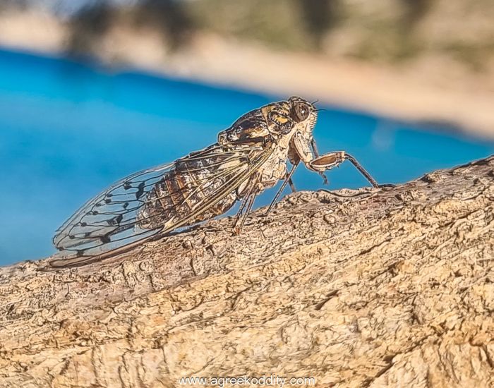 I mentioned that Platis Gialos has a sense of tranquility but it is by no means quiet. Up in the Tamarisk trees are cicadas – lots of them! When I hear their high pitched screech my active imagination conjurs up an image of little Pixies sharpening their knives on tiny grindstones. Cicadas don’t look fairy-tale-like at all. These brown and rather plain-looking insects move slowly along the branches of the tree shrieking out their mating call to the females with little respect for those wanting peace and quiet.