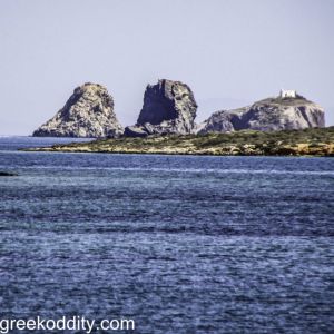 The narrow straight between Paros and Antiparos is very shallow and requires precise navigation. It was an earthquake in around 550 BC that caused a piece of land to separate from Paros and this became the little island of Antiparos. Signs of this volcanic activity is more evident as you pass the Northern tip of Antiparos where you can see a scattering of little islets spilling out into the sea. The sea between Antiparos and the uninhabited islands of Kato Fira (Diplo) is so shallow you can wade from one to the other. Beyond Diplo is Pano Fira and even further lies a rocky outcrop of small islets jutting out from the sea. Perched on top of one of the larger islets we can see a whitewashed church. As much as I’ve tried to Google, I can ‘t find anything that gives me the name of these islets or the name of the church – there is a reference on Google maps to Agios Spyridon but nothing else.