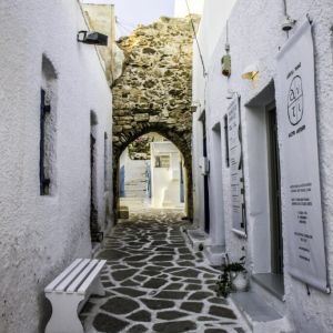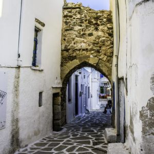 The Venetian Kastro (1260 AD) was largely constructed from the remains of the archaic Temples of Demeter and Apollo, remnants of which can be see in the form of the circular column drums now embedded in the kastro wall.