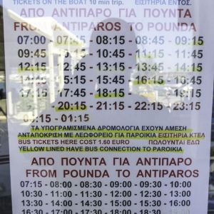 Pounda – Antiparos. This little car ferry shuttles back and forth across the short stretch between the two islands and takes 8 minutes. However, you will need to take the bus between Parikia-Pounda – a 10-15 minute journey. The bus stops on both islands are literally a stones throw from each port. The advantage of the car ferry is that it runs until late at night – especially handy if you are arriving on a late ferry!!