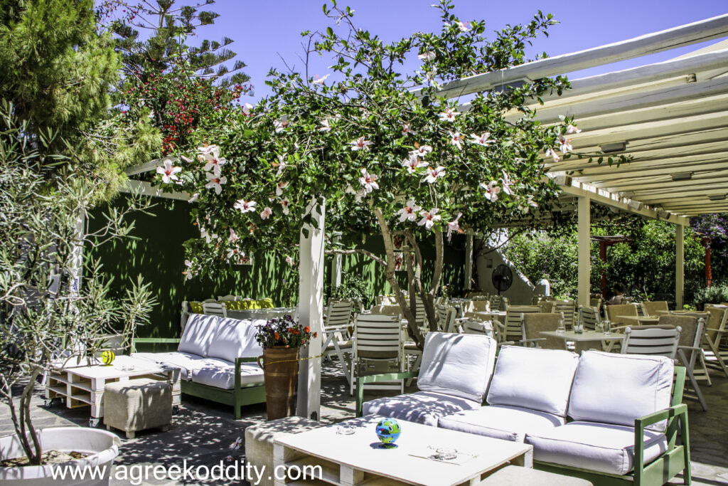 Just before we arrive at the bus station we pass a small place called Restaurant Pervolaria which advertises ‘A Taverna in the Garden’. A large pergola covered in hessian drapes and bougainvillea branches provide much needed shade. We have decided to eat at T’Ageri back on Antiparos tonight so decide to opt for cheese and spinach pies and a cup of tea just to tide us over. This is a nice family run taverna – the owners were very friendly and welcoming. It’s a little walk up from the centre of Naoussa and has very clean toilets. A wonderful place to rest a while when you have time to kill.