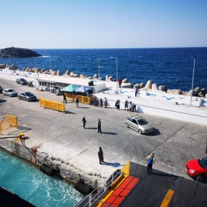 The luggage racks are clearly marked for the island of disembarkation – that bit is easy. The first officer I come to asks me for a document. He asks me in Greek and I don’t understand which document he needs. The ones I can see being collected in bear no resemblance to the papers I have which are my Covid vaccination certificate, my health questionnaire and my passenger locator form for arrival in Greece. It seems it is none of these and he points me towards another more senior looking officer. I display all three documents for him to look at and impatiently he shakes his head and then whips out my passenger locator form and waves me through.