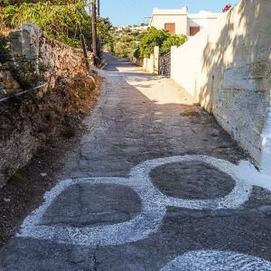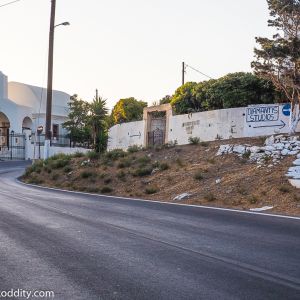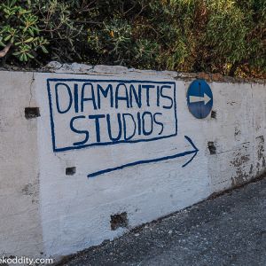 A little down the road on the right is the War Cemetery and also the Historical and Folklore Museum housed in the Bellenis Tower. Just beyond this on the left sits a church on the bend of the road. Google Maps tells me to turn right. There is a sign for Diamantis Studios painted on the wall and this is where the route begins. The direction is up and over the hill behind Alinda.