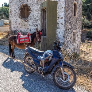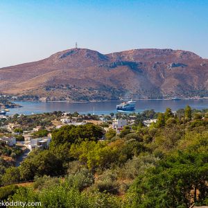 The hillside here is covered in olive trees and everything still feels beautifully rural. I stumble across a donkey parked up next to a motorbike – or was it the other way around. I bend down to talk to him and as I rise I notice two men sitting on a doorstep laughing at me. A little bit further down the road I reach a point where I can either take a path through the olive groves or continue on the road where there are mountain views and I choose the latter. Further around the corner I can now see the port of Lakki doubly confirmed as I can see the Blue Star 2 sailing out of the port.