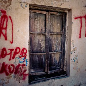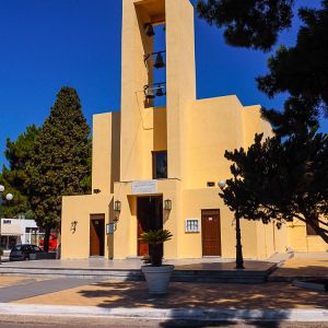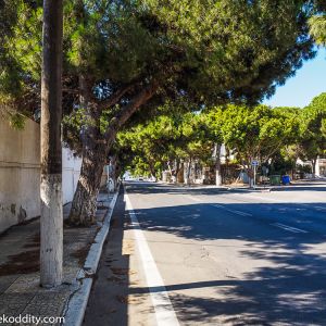 On the way down from the mountain (OK it’s a hill but as it’s my legs, it’s my choice to use a bit of artistic license!) I’m walking in full sun. Where I can, I hug the roadside to catch any shade available. Eventually the road widens out as I approach the town. I pass a big pharmacy, a ceramic centre and a large supermarket – I guess our version of an out of town retail area. I walk past semi derelict buildings and the large, austere looking church of Agios Nikolaos where the bells are ringing. It sounds like funerary bells to me but I can’t see signs of this as I pass. The Orthodox art deco church was formerly the Roman Catholic Church of St Francis.