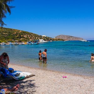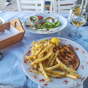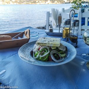 Back at Alinda I spend the rest of the afternoon swimming to try and cool off. Later I eat at O Kavos Tou Vasili where the tables are set out on the beach. The service is very friendly there and I order a Greek salad, chicken souvlaki and some white wine. A little later I’m given another bottle of complimentary wine so end up staying a little longer than I’d planned!