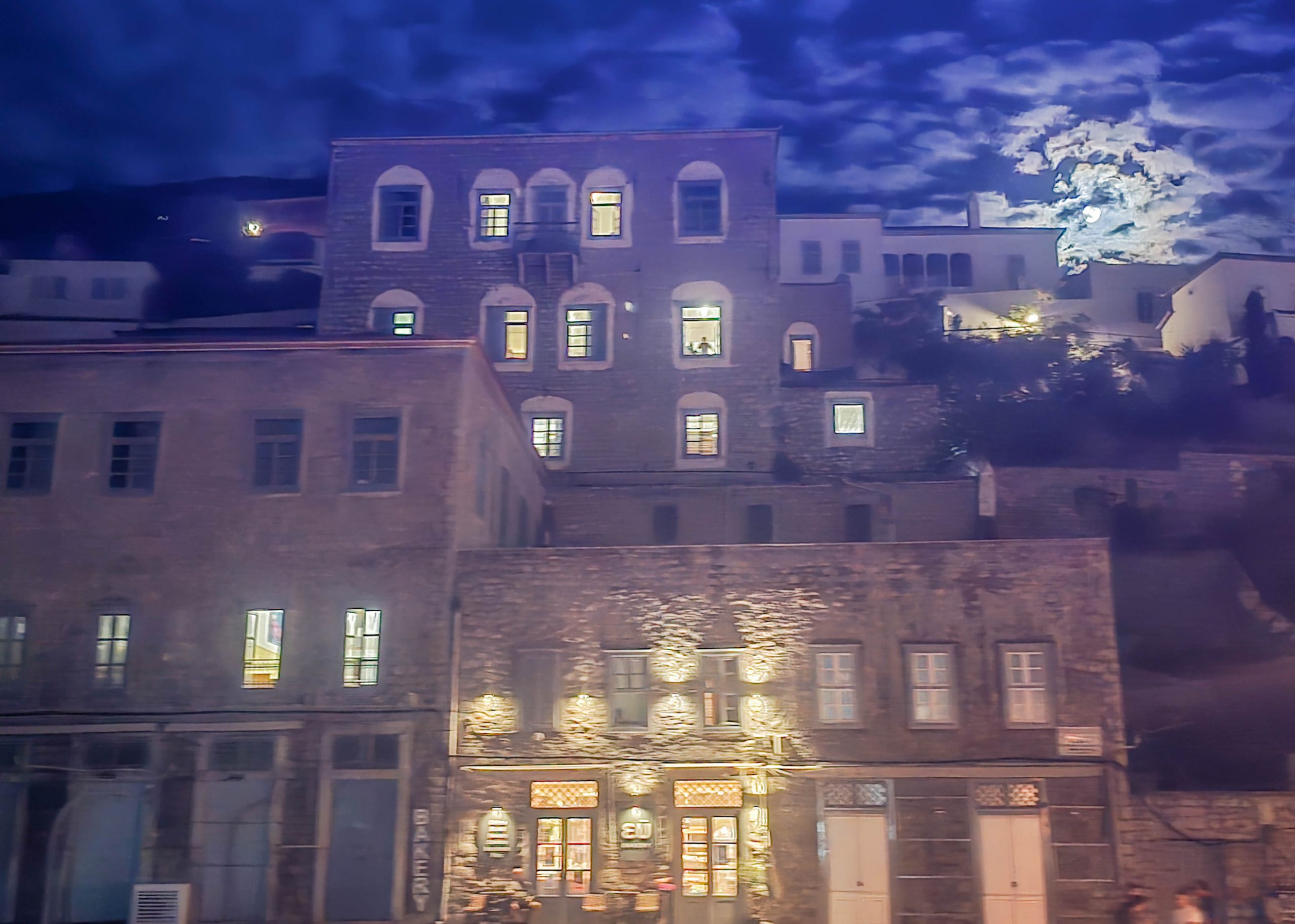 The final boat of the day made an additional stop at Ermioni, stretching the journey into darkness. I’m not especially fond of high-speed ferries. Not because I get seasick, but because I dislike being pinned to one seat, staring through salt-streaked windows. Still, the boat was almost empty, and I was able to move from seat to seat as the boat pulled into each port. By the time we passed Poros and Hydra, the latter briefly illuminated by a full moon, it was too dark to recognise anything from my visit back in 1993 – over thirty years ago now. Even through the blurred glass, Hydra looked very atmospheric. Enough to spark curiosity. Maybe I’ll have to pop over to refresh my memory.