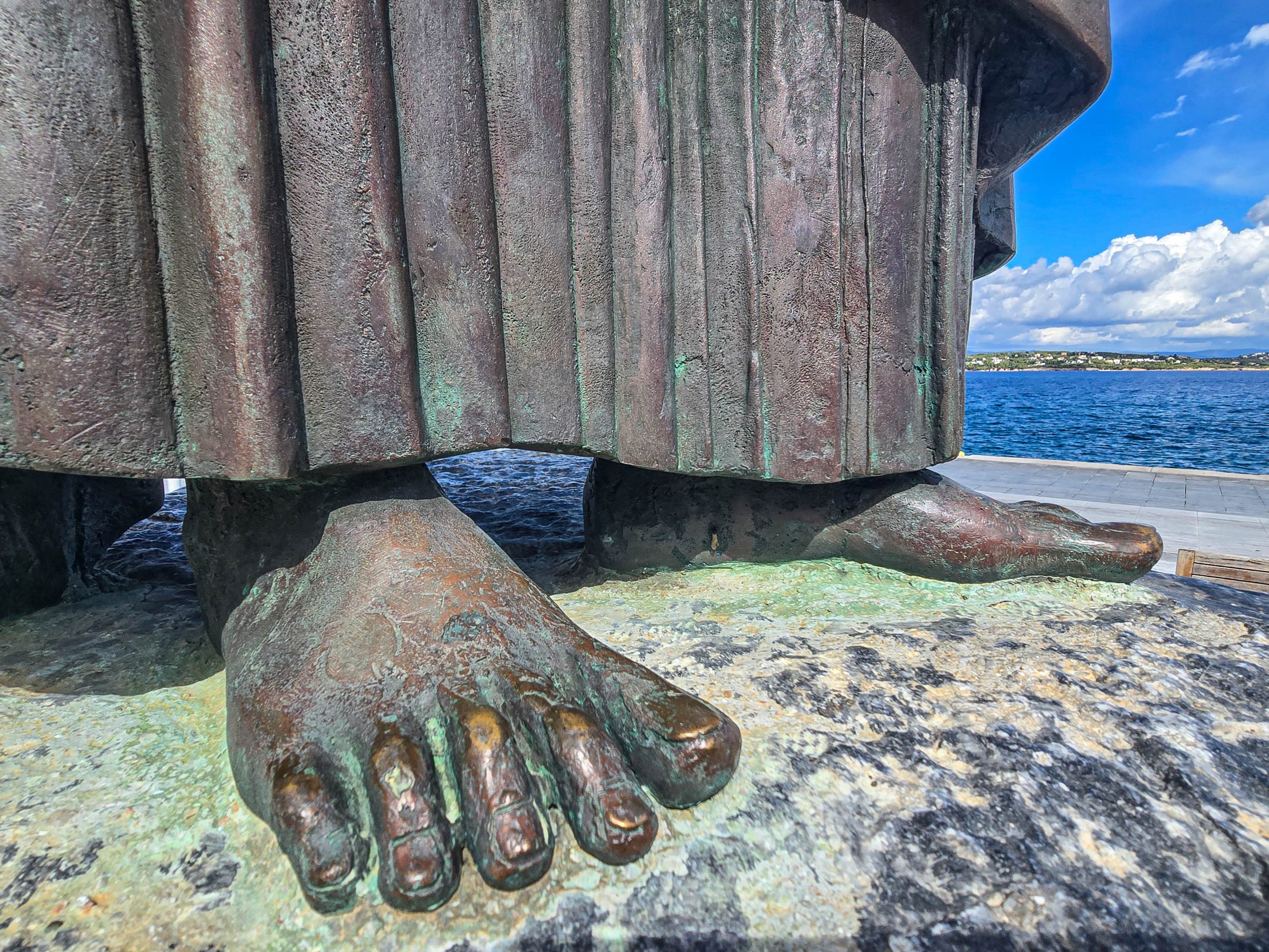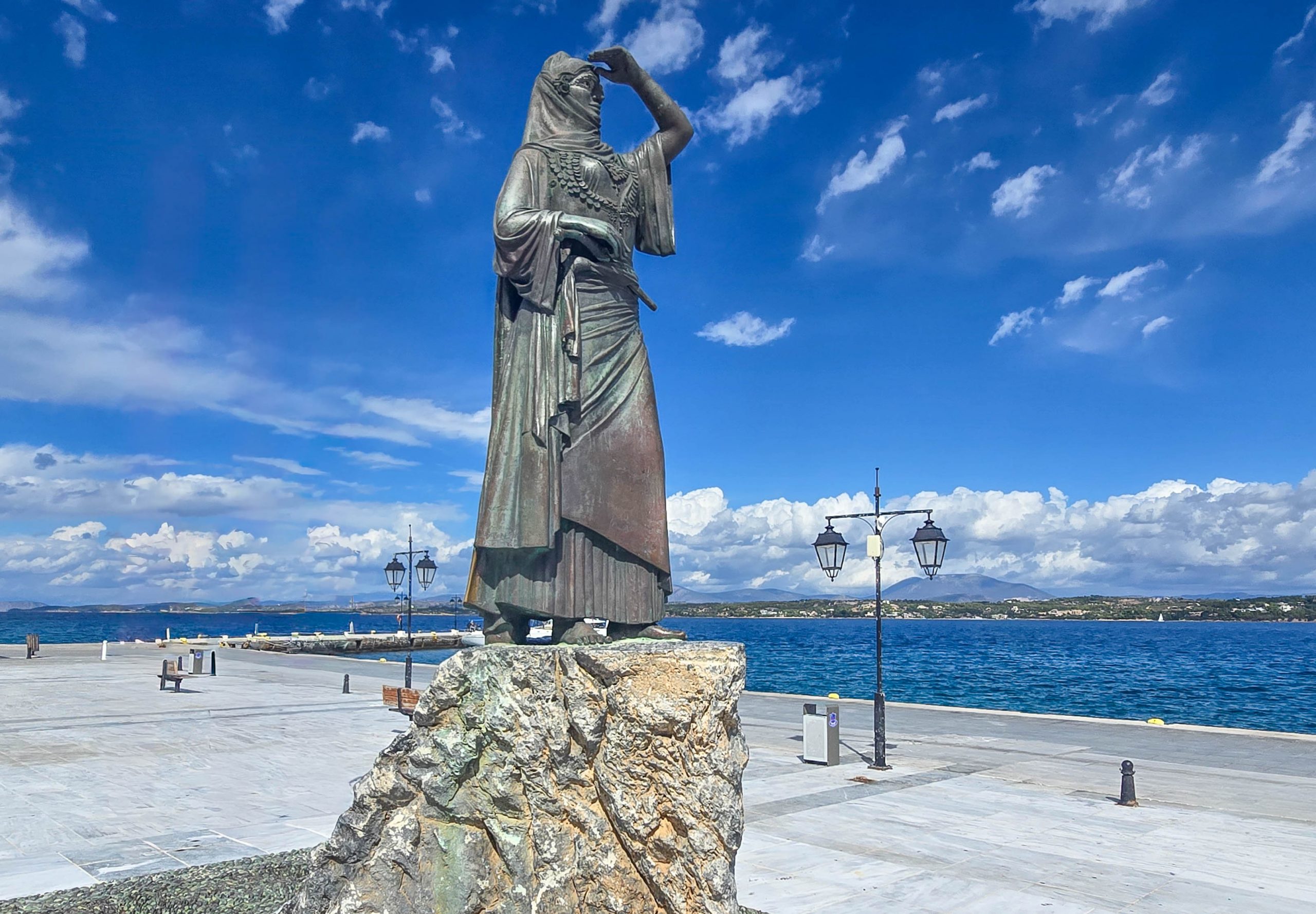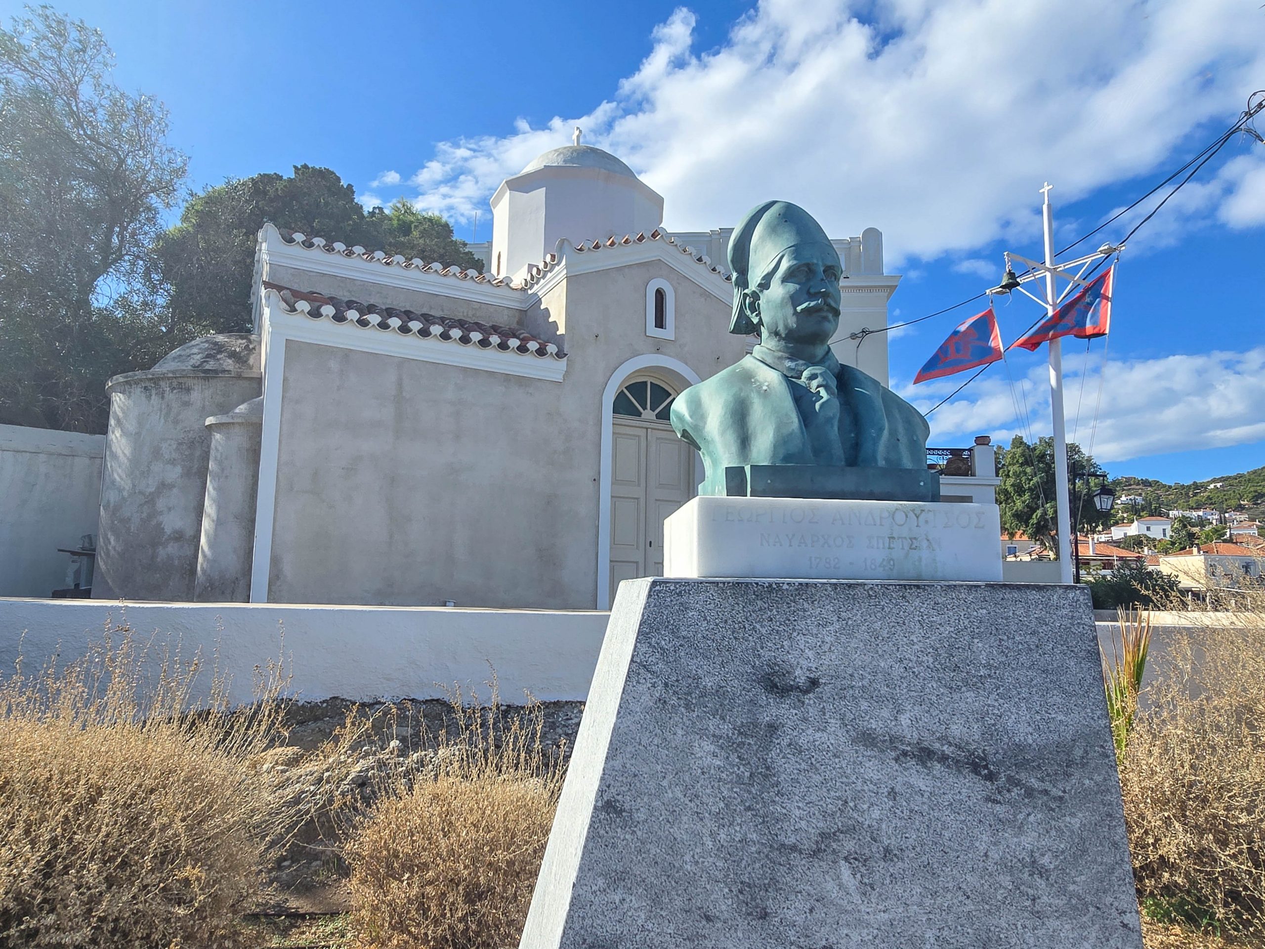 At the promontory’s tip stands the statue of Kosmas Barbatsis, commemorating the moment he set his fire ship against the Ottoman flagship in 1822. Meller’s work cannot show smoke or flame, but it captures something else — the defiant forward step of a man creating legend.