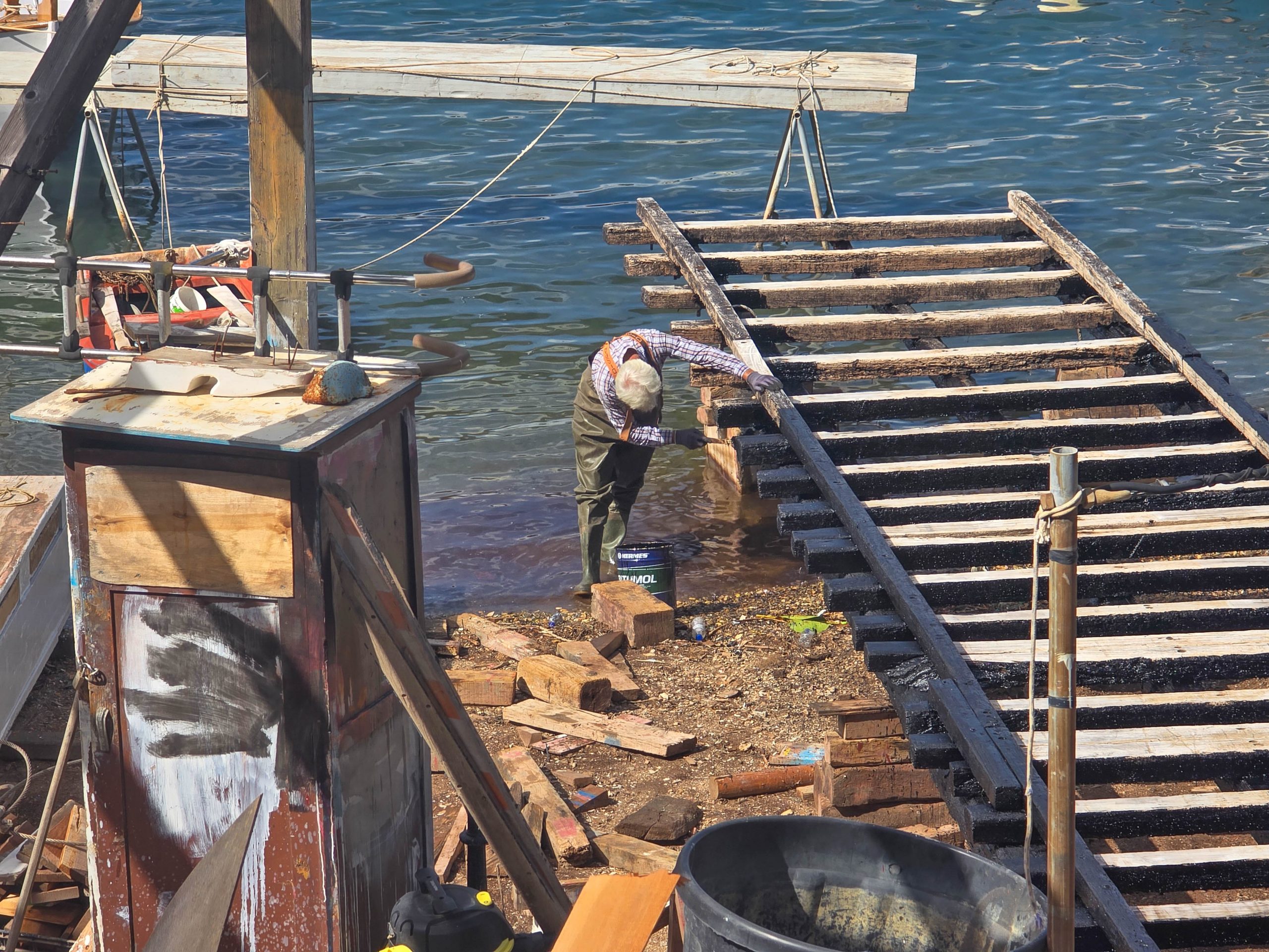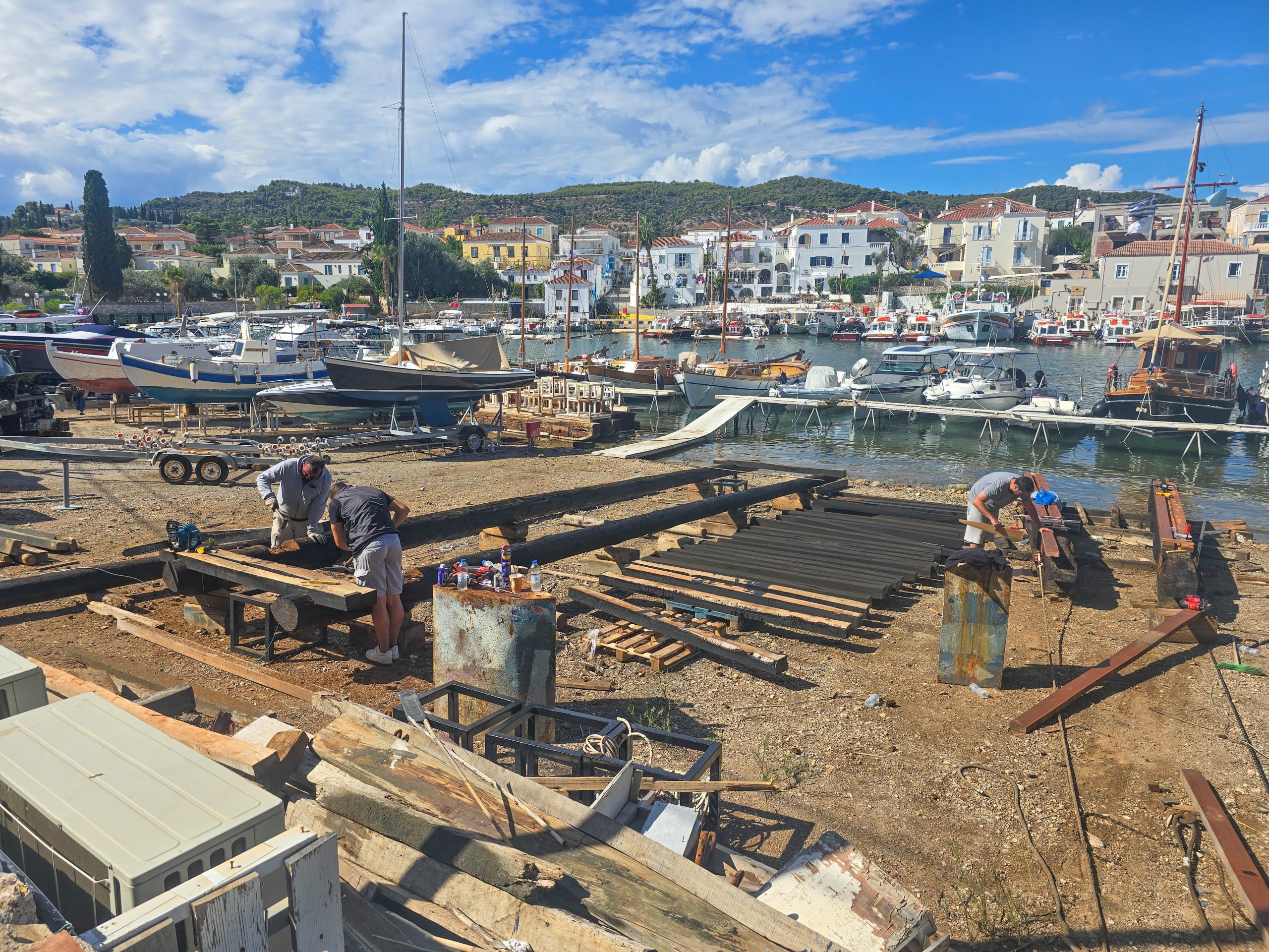 Turning the corner, the atmosphere shifts again. Palio Limani, the Old Harbour, lies around 1.5 kilometres from Dapia and remains a working boatyard. I watched craftsmen constructing new skaria — wooden runners, or skids, used to slide boats between land and sea. Winches, pulleys and all manner of boatyard accoutrement lay scattered about, seemingly cast aside, but I don’t doubt every single tool had a role to play in boat maintenance and construction.