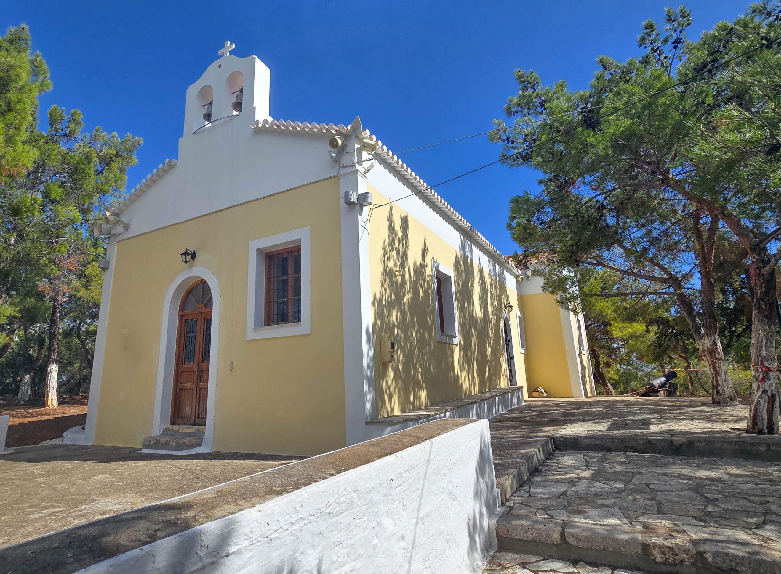 Agios Mamas was built in the 1820s in thanksgiving to the Virgin Mary following the decisive naval clash of 8 September 1822. Each September, the island still commemorates that victory with the Armata celebrations — candlelit processions, a symbolic sea battle and fireworks.