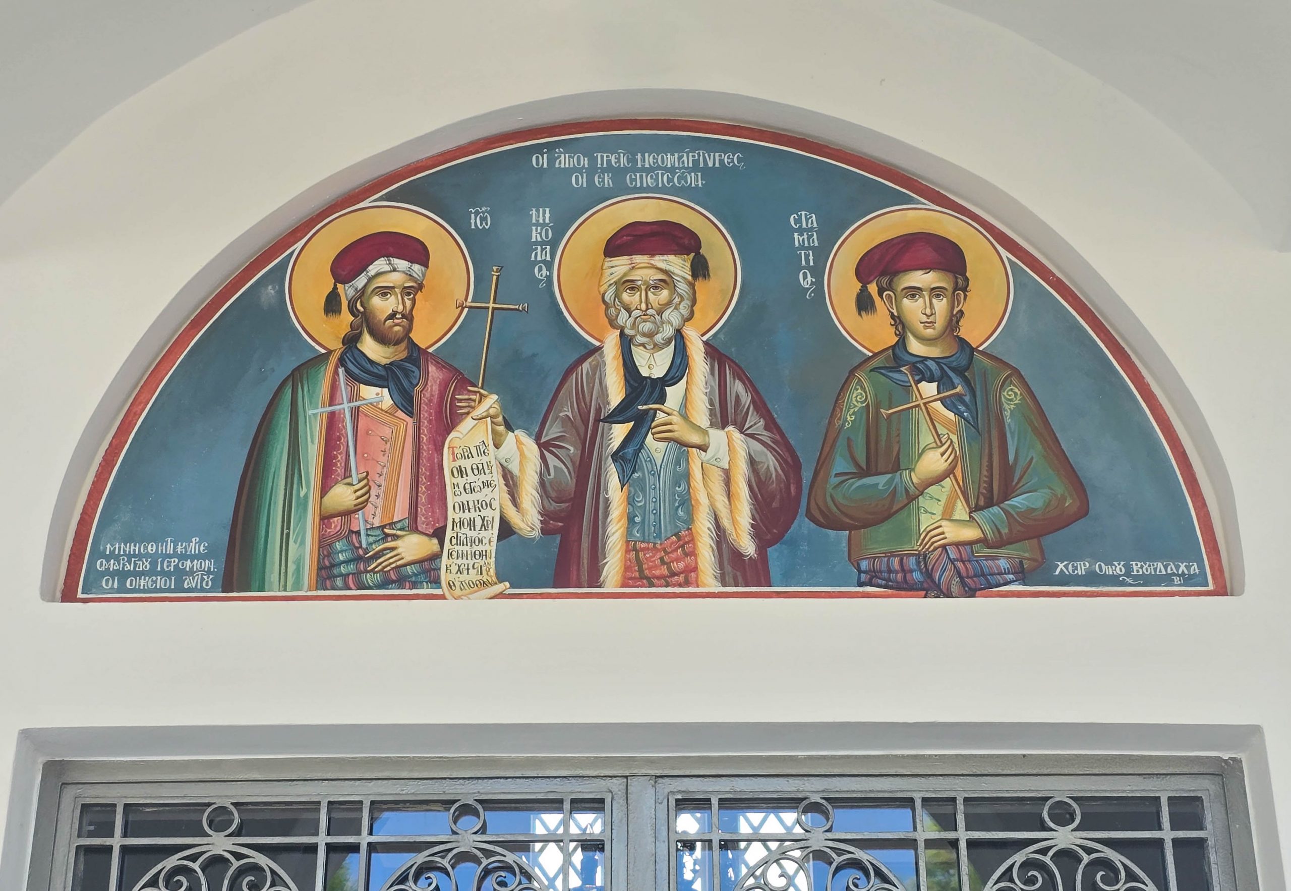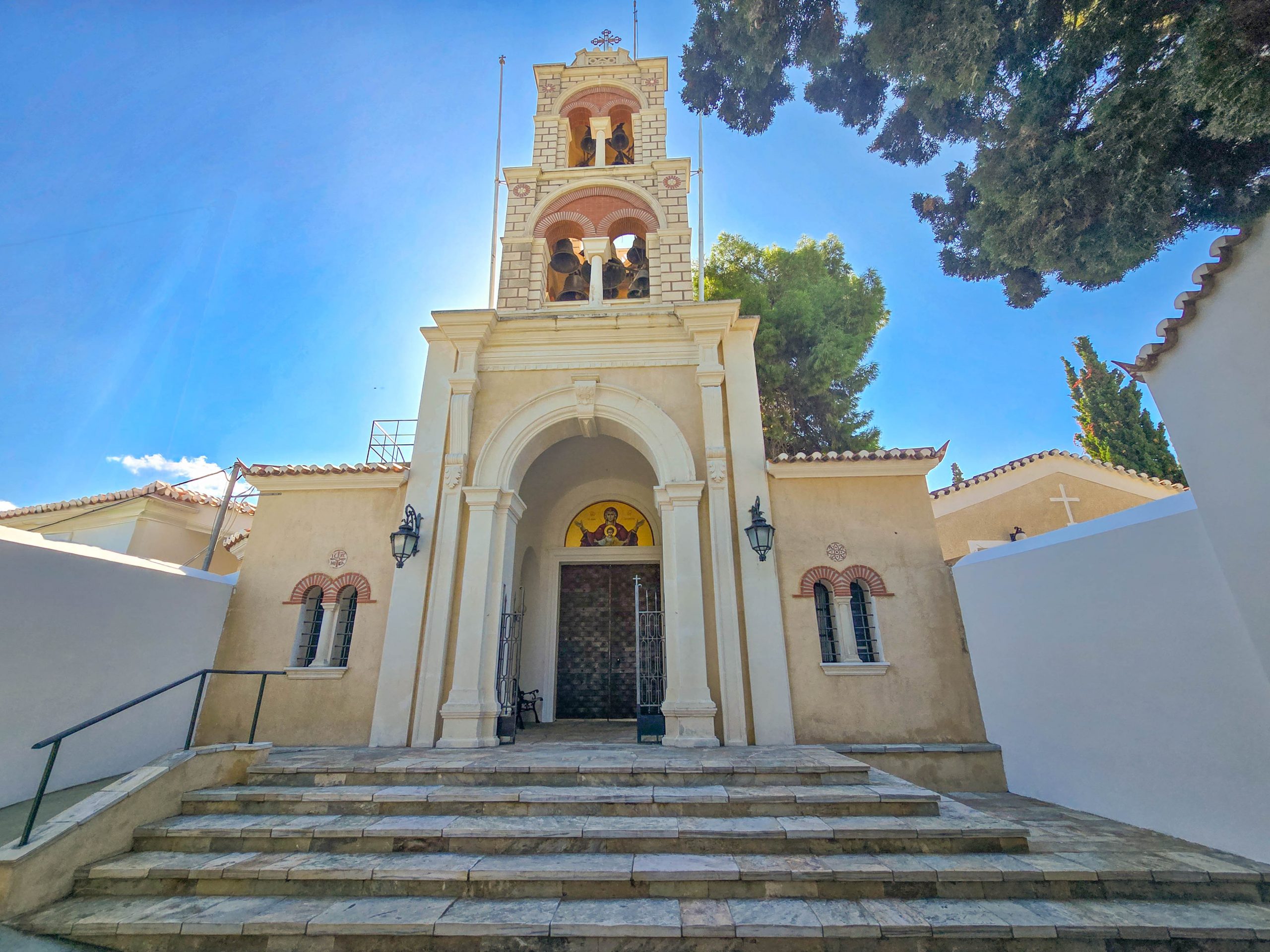 Set slightly back from the waterfront, the Church of the Three New Martyrs of Spetses occupies a prominent position along the road between Dapia and the Old Harbour. The church commemorates three Spetsiot sailors — Nikolaos Tsion and his nephews Yianni and Stamatios. They were arrested in Chios in early 1822 during a commercial voyage, tortured, and ultimately martyred for refusing to renounce their Christian faith and revolutionary allegiance. Their story resonated deeply on Spetses, where they are remembered not only as religious martyrs but also as symbols of the island’s collective sacrifice during the War of Independence. The church itself is relatively modern, its construction beginning in 1975 through donations from both named and anonymous benefactors, yet its emotional weight firmly anchors it in the revolutionary era.