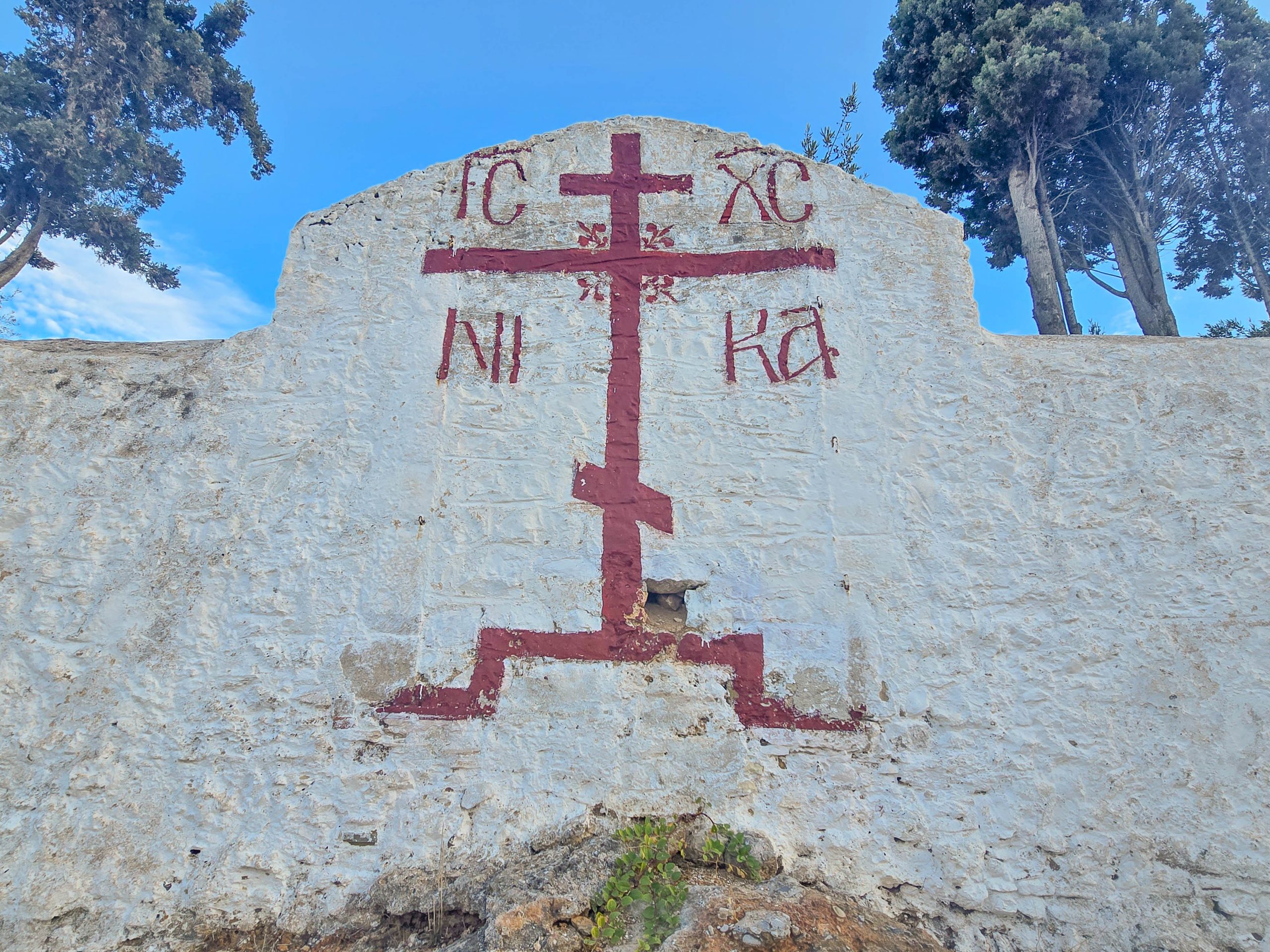 Nearby stands the modest Agios Mamas Church, long associated with protection and everyday devotion rather than ceremony. Painted onto a neighbouring wall is the familiar Orthodox inscription IC XC NIKA — Jesus Christ conquers.