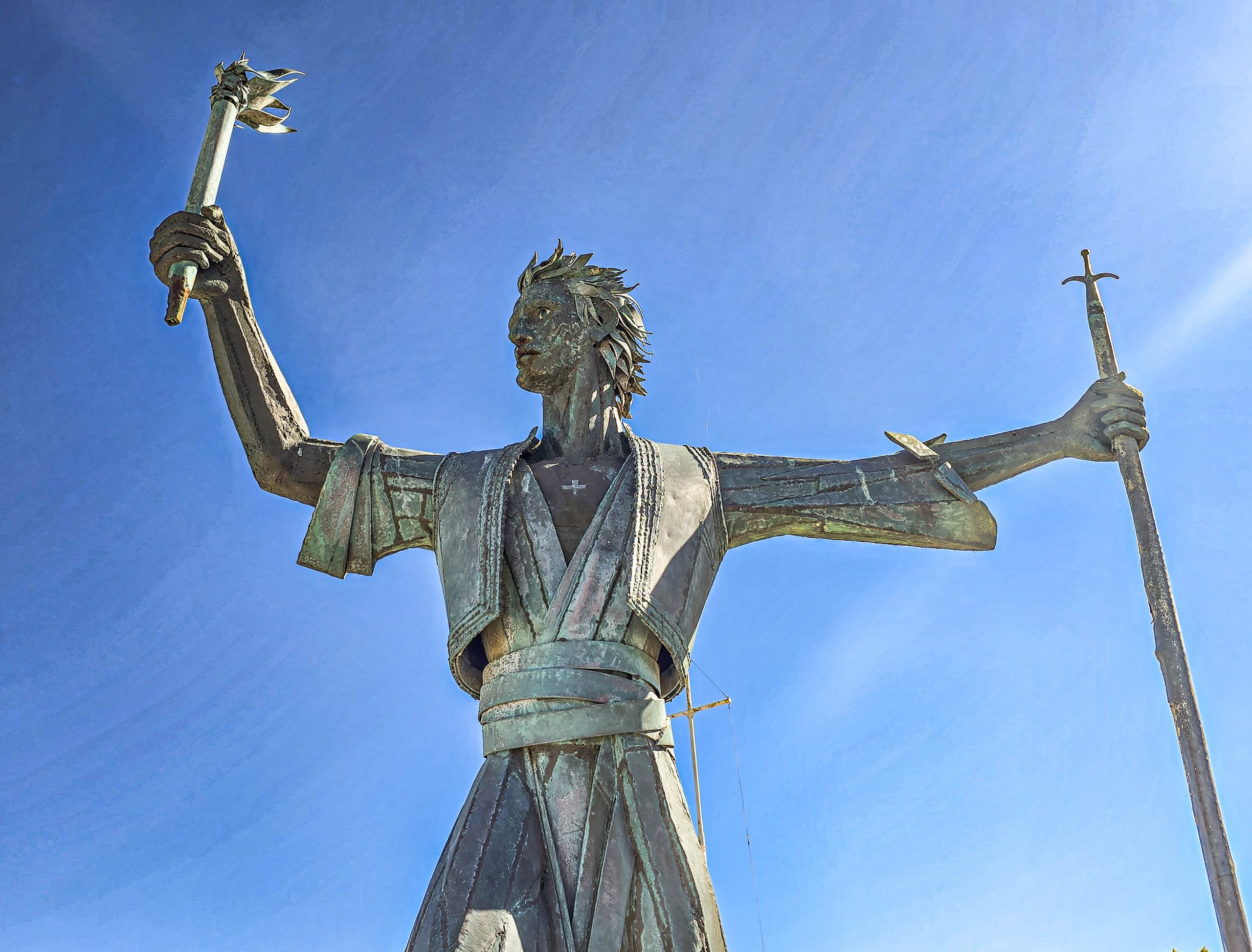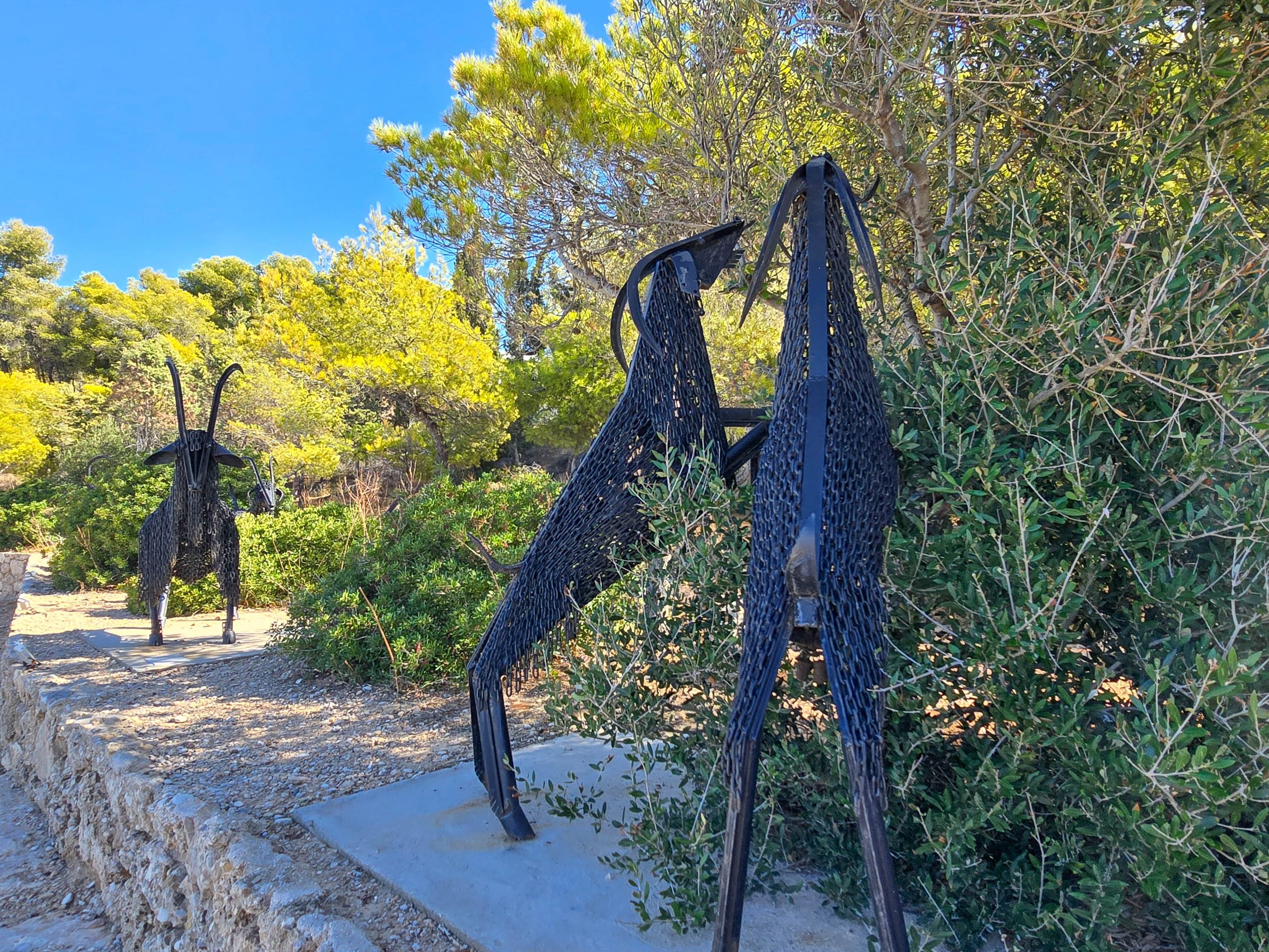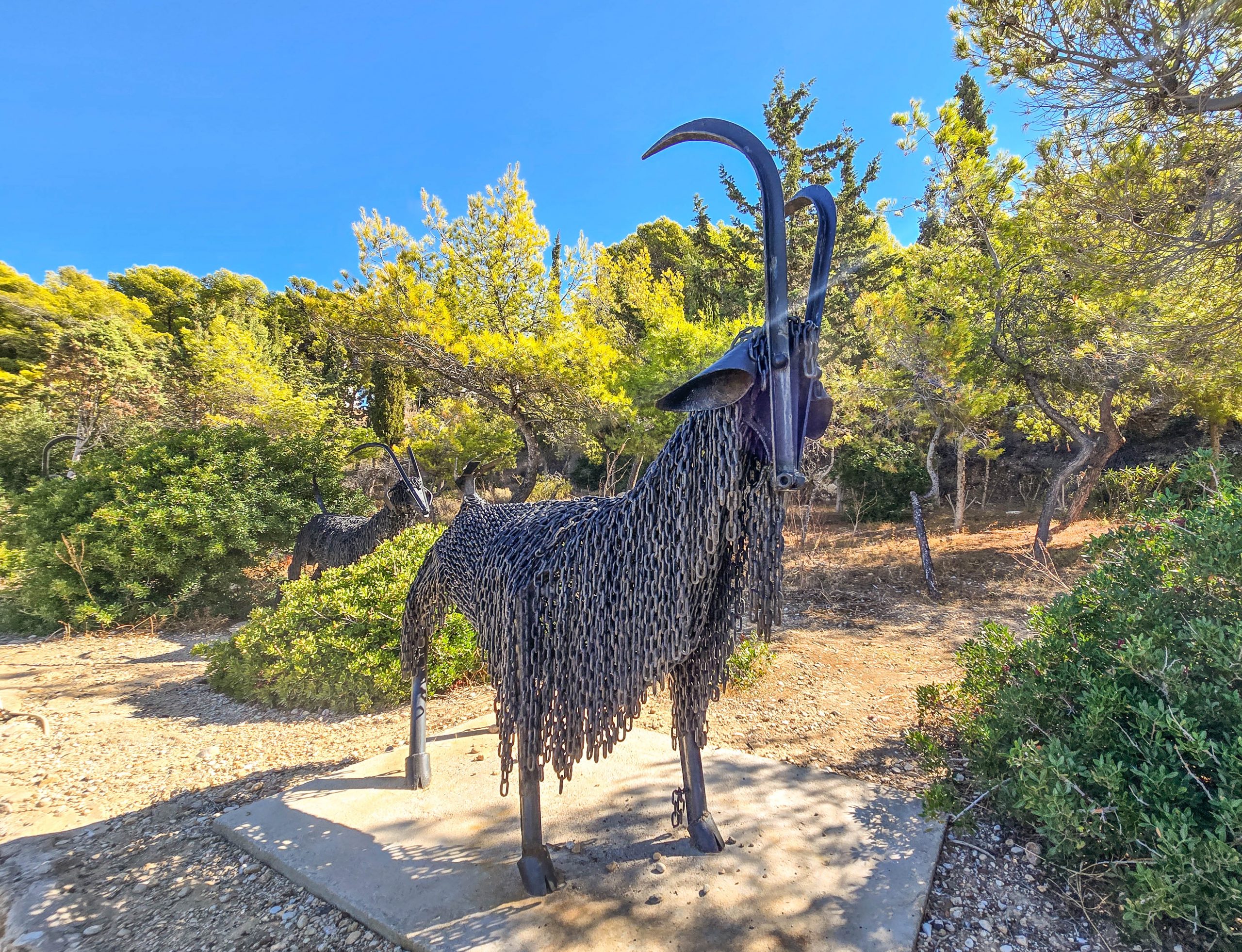 From the lighthouse, a track leads into the Municipal Park of Historical Monuments, where sculptures by Natalia Meller punctuate the landscape. A cluster of goat sculptures appears to gnaw at the greenery. Below, a striking silver mermaid gazes across the harbour, spear in hand, as though calling ships home.