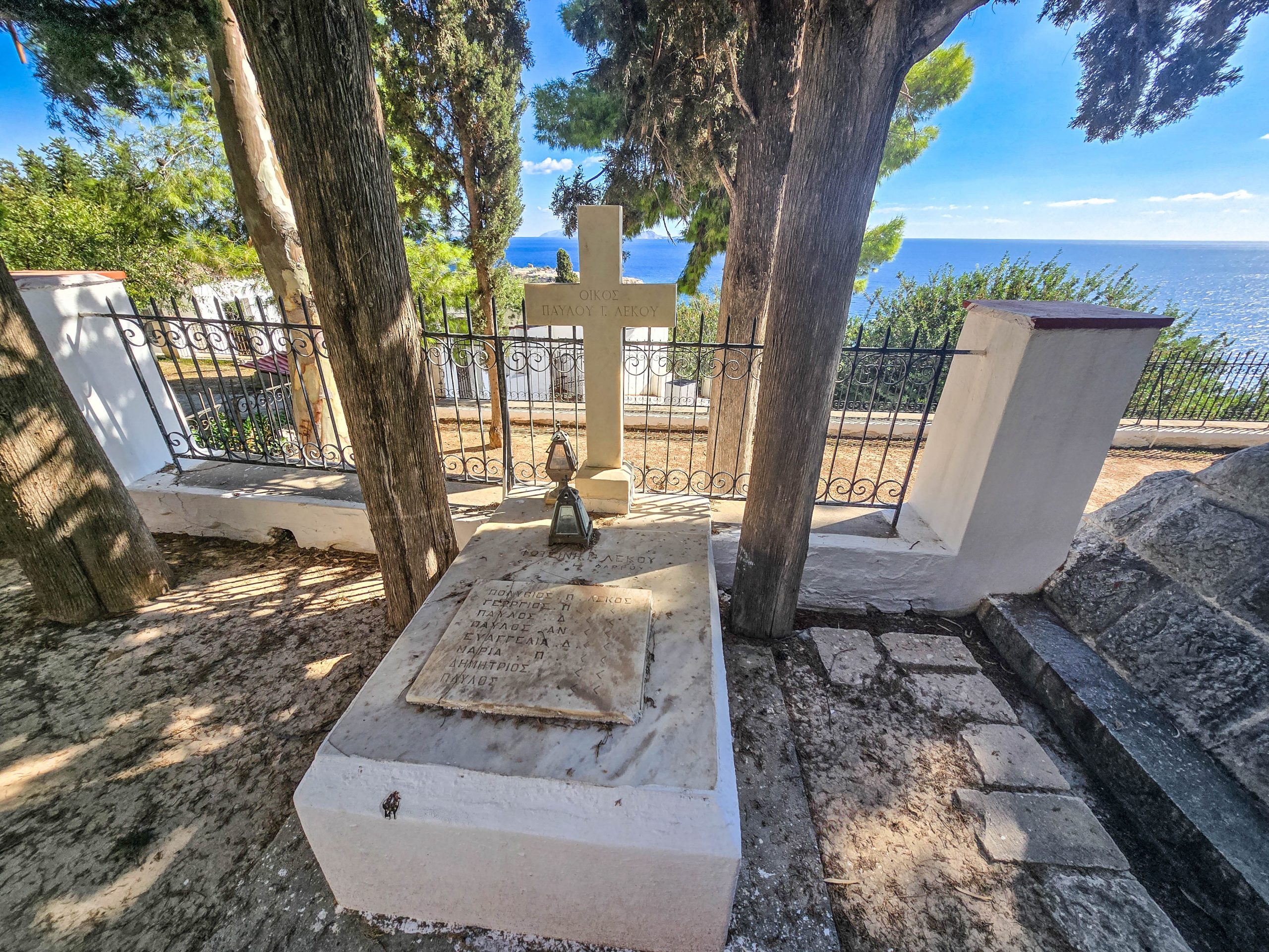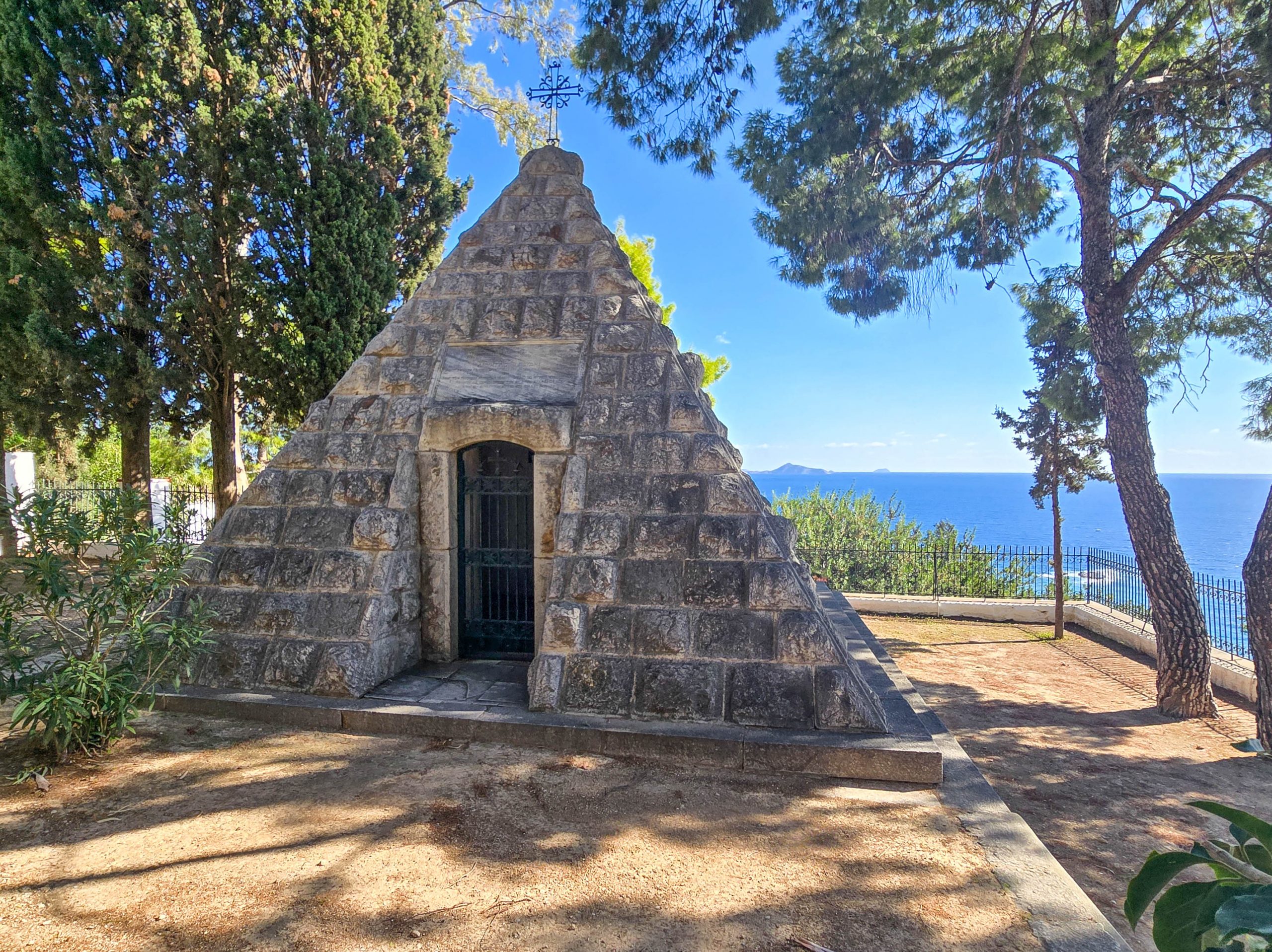 A few minutes later, a nun, visibly surprised to see visitors, opened the doors and ushered us in, directing us towards aprons, which we dutifully put on. In the courtyard stood a striking triangular pyramid, which serves as the tomb of Dimitrios P. Goudis (1824–1891), a prominent benefactor and landowner closely connected with the monastery. The views from the monastery down to the coast were breathtaking. Before we left, the nuns offered us water and loukoumi, and invited us to light candles — a small gesture of hospitality.