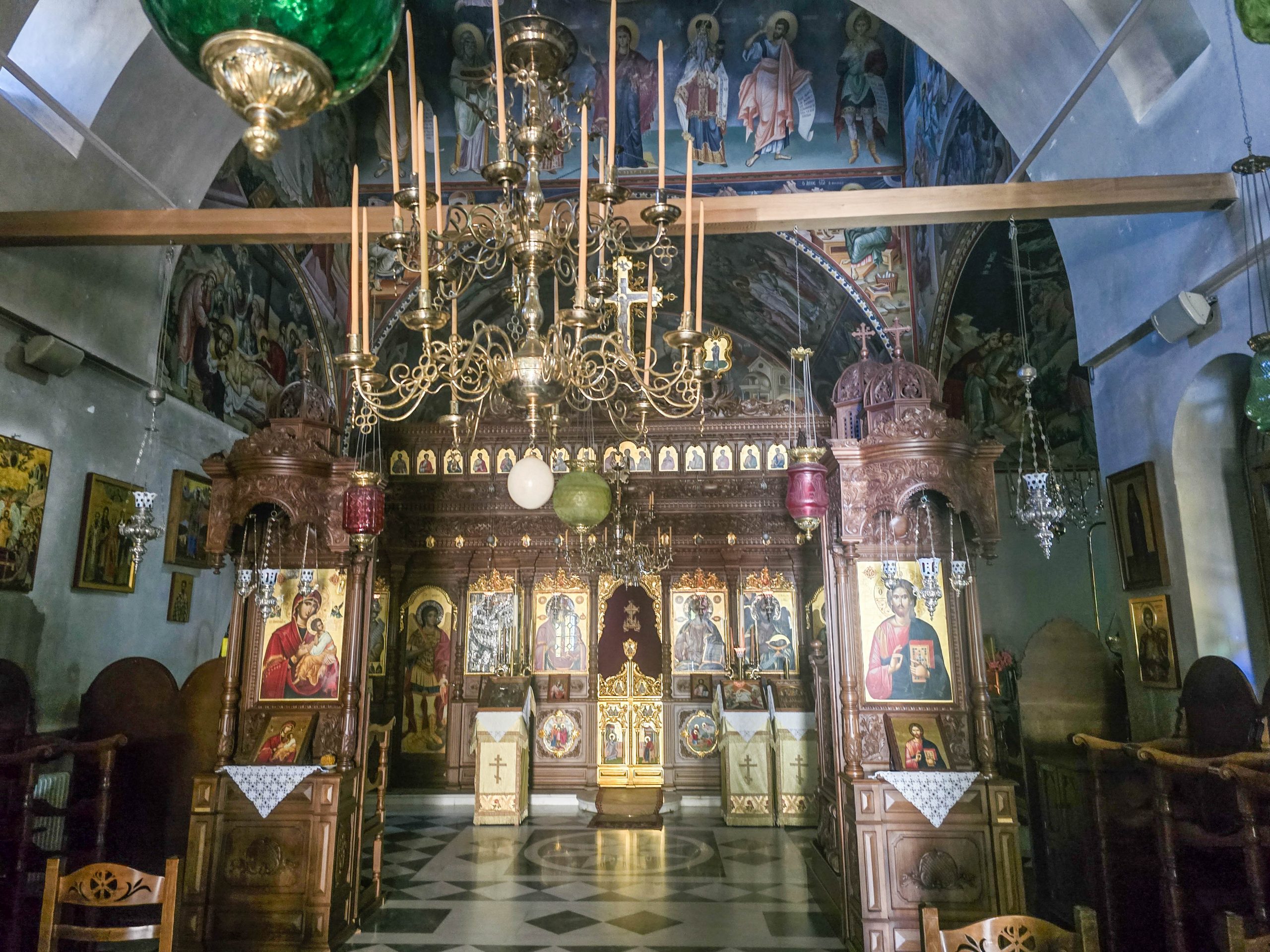One Sunday morning, I made my way up the hill to the Holy Monastery of All Saints (Moni Agion Panton), having been advised by Aggeliki that this is usually the only day it opens to visitors. Fir trees and Italian cypress lined the approach, the air cooler and resin-scented as the sounds of the harbour faded away.