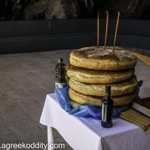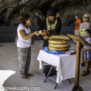 After the service has finished I venture out into the midday heat to have a short wander by the church. Two ladies help the priest wrap the remaining bread in large cloths which is taken back inside the church. Shortly after I see the priest leave with his assistant. I take a few photographs of the view over the bay and then walk into the shade of the cave entrance to wait for Peter.