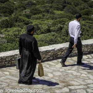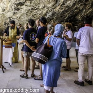 The priest isn’t here and we start making our way towards the steps down to the cave. A man who appears to be a tour leader with the large party calls to a couple of Greeks who are also walking towards the steps – as we turn to hear what he is saying he tells us “not you” and shoos us forward with his arms.
