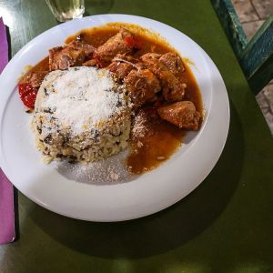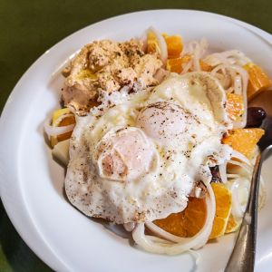 The next destination that we visit is the restaurant To Mavromichaliko the former home of one of the Mavromichalis brothers. This 200 hundred year old building is gorgeous. Again like some of the other restaurants, they make their own pasta which can be selected from the shelves in the restaurant to be cooked as part of your meal. Of course we have to try at least one of the things on the menu from the video and we opt for the very unusual salad made with oranges, potatoes, onions, spicy cheese, olives and fried eggs – and it is gorgeous! I also have pork cooked with currants and Peter has the beef cooked in tomatoes with the home made pasta – all washed down with organic white wine!