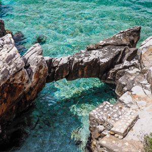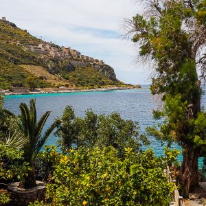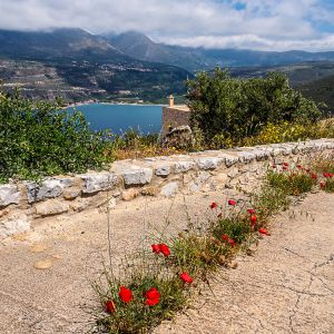 Before long we arrive at the main road and continue to follow it down, hardly any traffic passing as we walk. Slowly the bay below us begins to reveal itself. There is the brightest border of turquoise sea that you can imagine. There isn’t a beach here in Limeni but you can swim from the harbour wall.