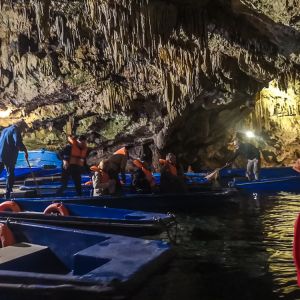 He drops us at the ticket office first and then drops us close to the entrance where there is already a small group of people. We are ushered into the entrance and given a life vest to wear. We are then led into a small boat and take off in a convoy across the lake. I must say that the boatmen steer the boats with great skill. Rocks from the cave lay within centimetres of our heads and just as it looks as though someone is in for bump on the head, a gentle tap on the wall with the oar diverts what looks like an imminent injury!