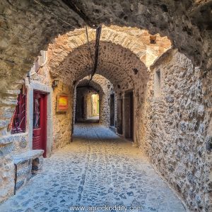 There are several other stops at small holdings for people that live between villages. The driver helps some of the elderly ladies off with their bags. It takes less than an hour to travel the 35 kilometres to Mesta. When the bus arrives it stops on the main road and it is a short walk along a road before you reach the outskirts of the town. At first I try to work out how to get into the village. It becomes clear that the houses are connected to each other forming a fortified wall. I enter through one of the gates by a small taverna and shop. I follow the cobbled streets with no particular plan. Occasionally I will come to a dead end and have to return the way that I came – but that’s half the fun isn’t it.