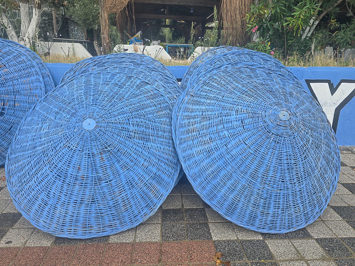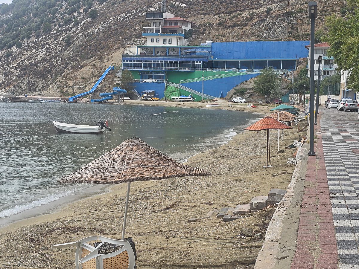 We headed west along the promenade that backed the narrow sand beach. At the very end, we were surprised to see a kind of water slide into the sea. It seems Cinarli is quite geared up for tourists – summer tourists anyway. As we made our way back there were already signs of the season coming to an end as a group of young men began to gather in the bamboo parasols.