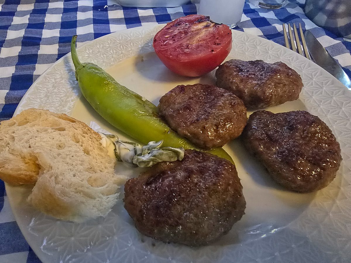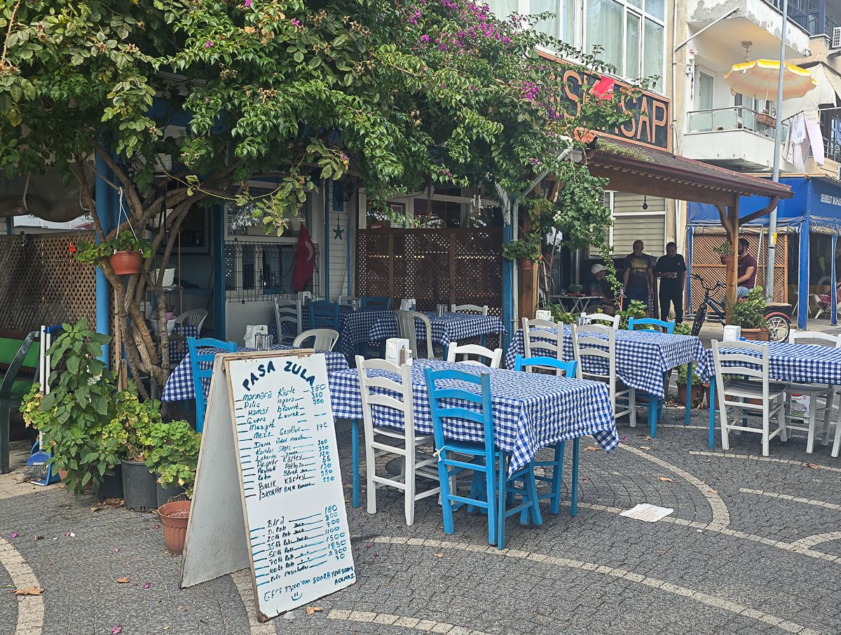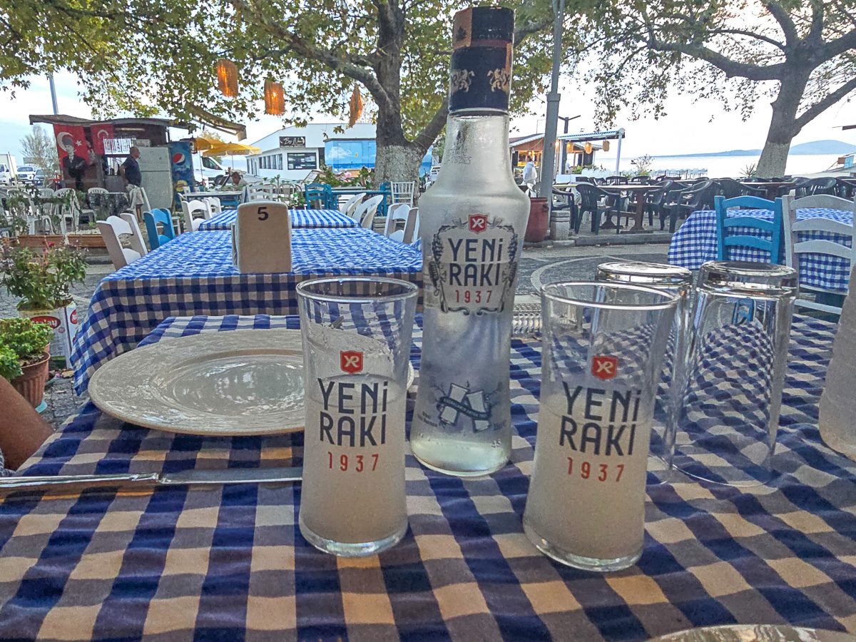 Later that evening, we dined at Pasa Zula Restaurant, looking towards the harbour. After the borek in Cinarli, we didn’t have much of an appetite, so we had something small. We had the yoghurt-based appetiser that we’d had several times so far but this time I made a note of its name. Semizotu Yoğurtlaması is a combination of strained yoghurt, garlic and purslane leaves. The waiter in Birol had shown me in Google Translate that it was bay leaves, but it definitely wasn’t. I thought they may have been caper leaves because of the rounded shape, but nope – purslane. One of the other appetisers was Pogaça, a kind of baked muffin filled with a feta-like cheese. This was washed down with more (expensive) Yeni Raki.