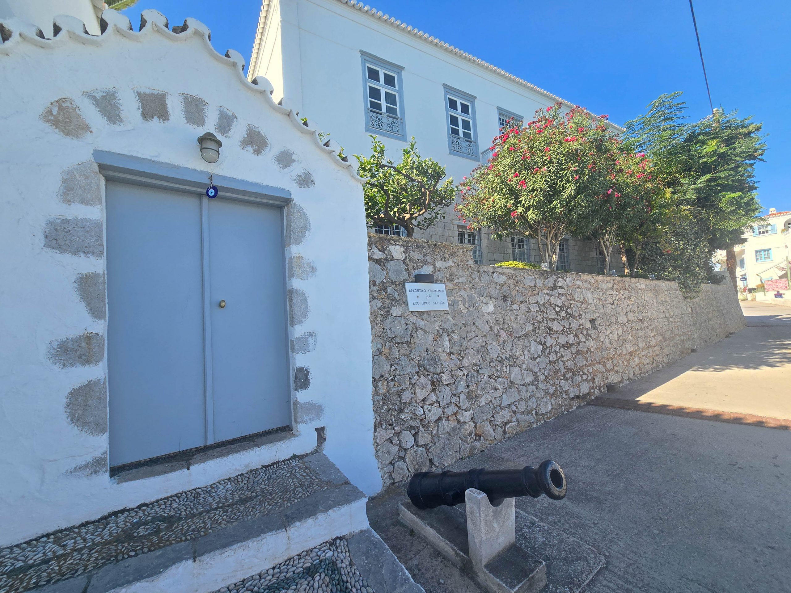 Some of the beautiful neoclassical mansions date from the period when Spetses was shaped by maritime wealth. The Town Hall occupies the mansion of the Kyriakou family, donated to the Municipality by heir Mina Izailof. One of the oldest buildings in the settlement, it’s a fine example of the pre-revolutionary architecture that predates the island’s grander neoclassical mansions. The nearby Archontiko Economou is an example of a classic Spetsiot archontiko, reflecting the prosperity once generated by shipping and trade.