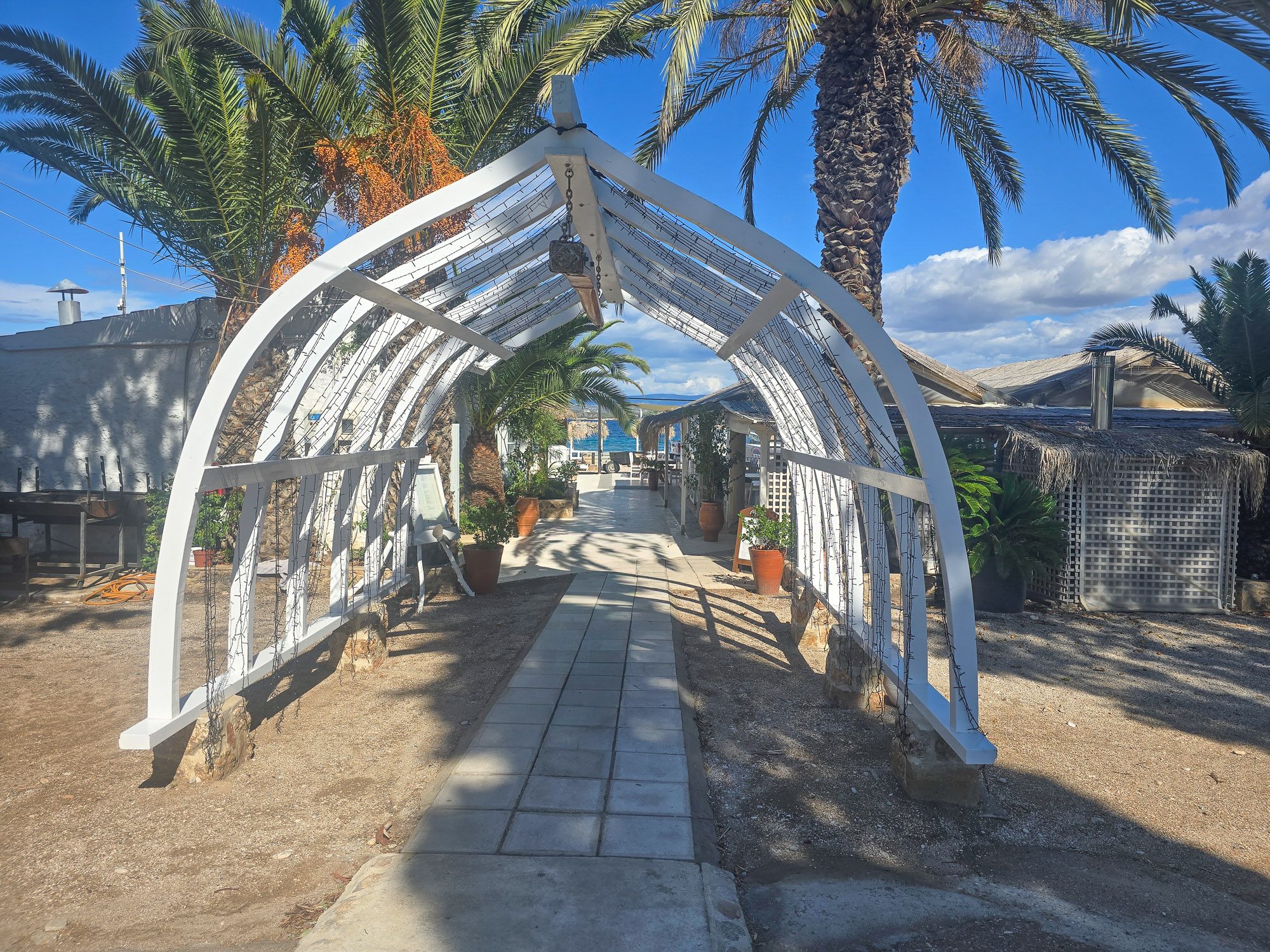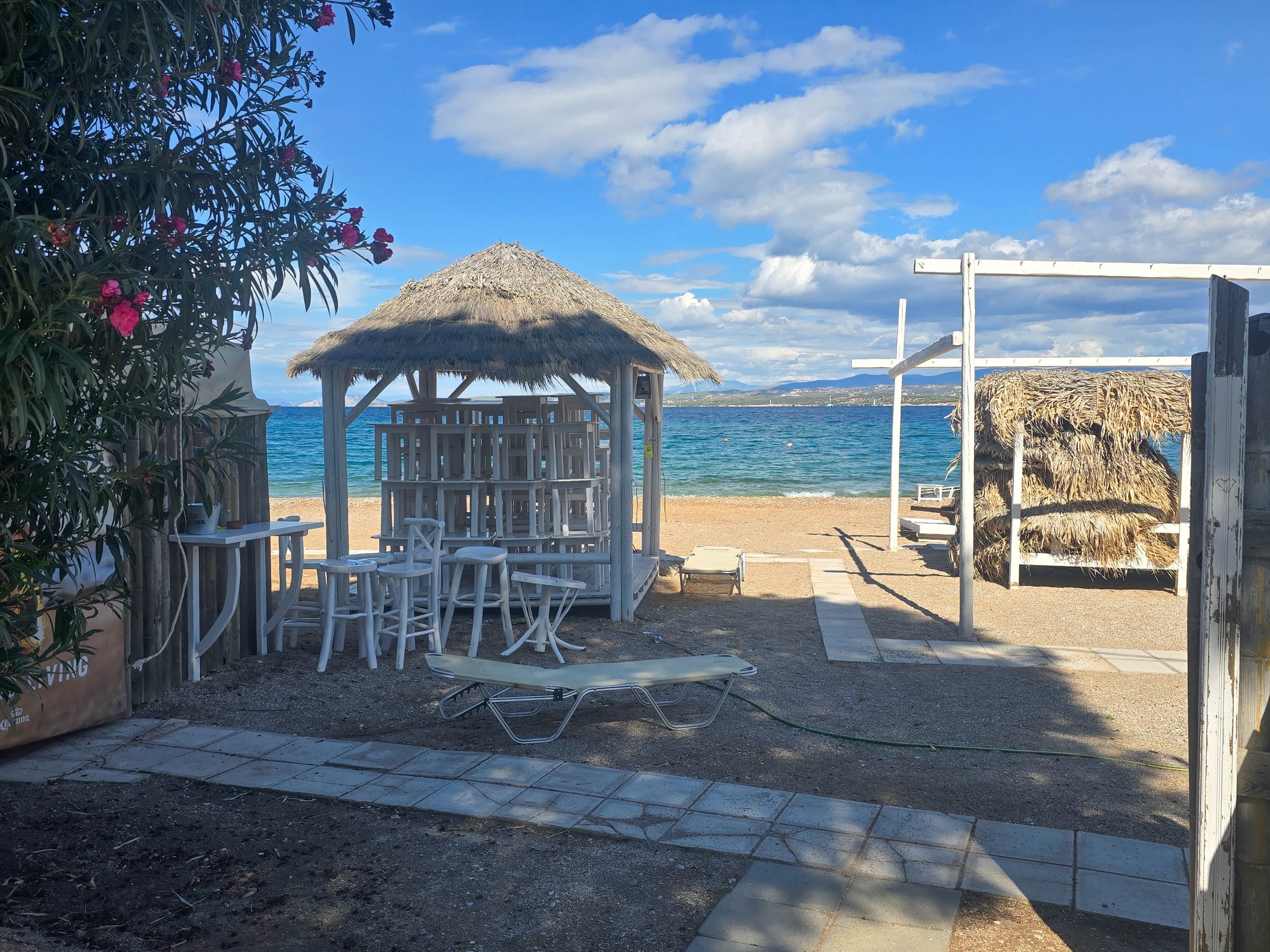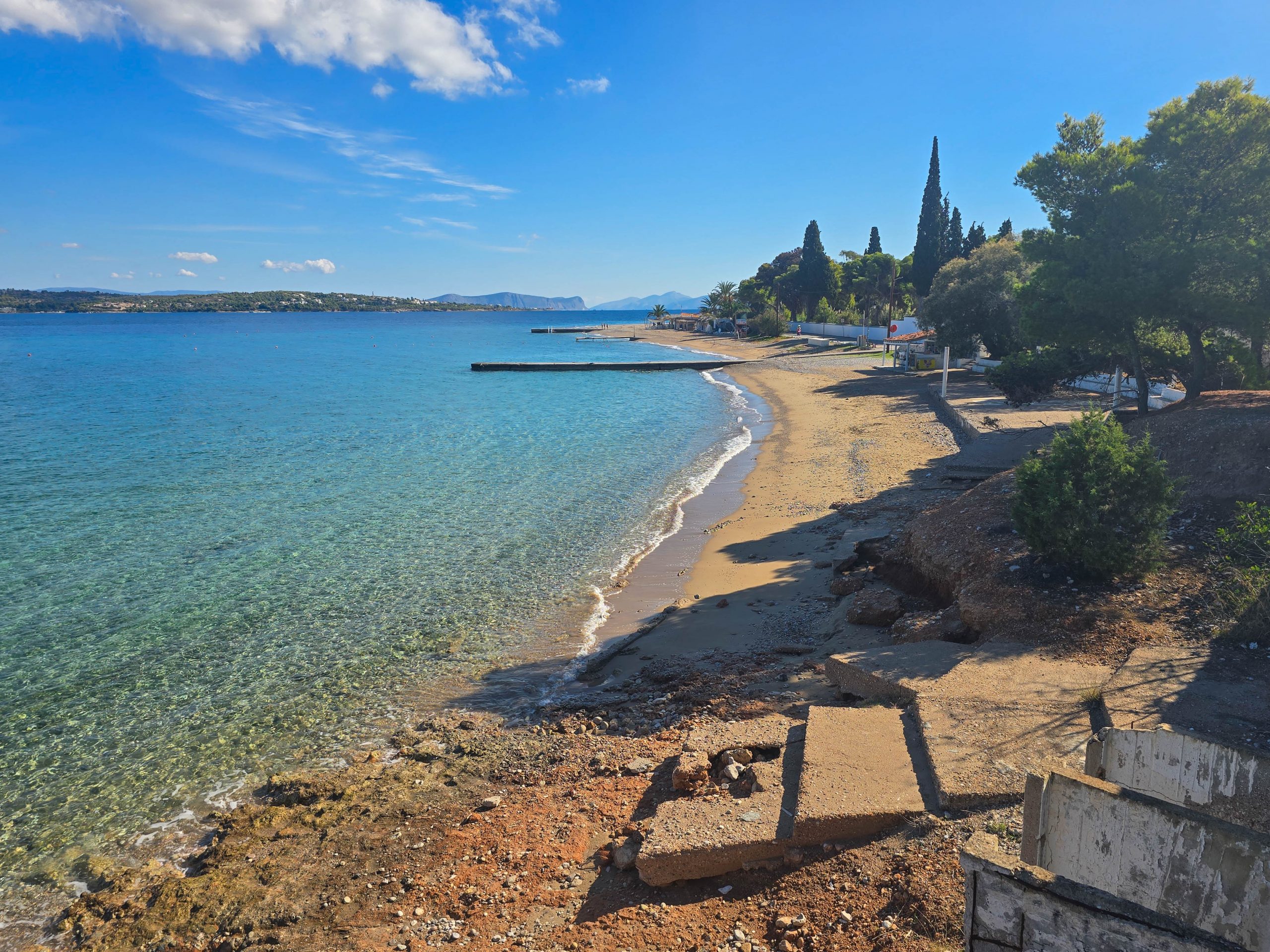 Kaiki Beach itself is an organised stretch of sand and fine shingle. When I passed through, workers were dismantling the palm-frond sun shelters, signalling the end of the season. From here, the view stretches across the narrow channel to the Peloponnese, close enough to feel almost within reach. Further along, the beach gives way to a quieter section, where a small cantina was still serving refreshments, even in early October. This quickly became my preferred spot to catch a few autumn rays and to watch the arrivals and departures across the strait to and from Kosta.