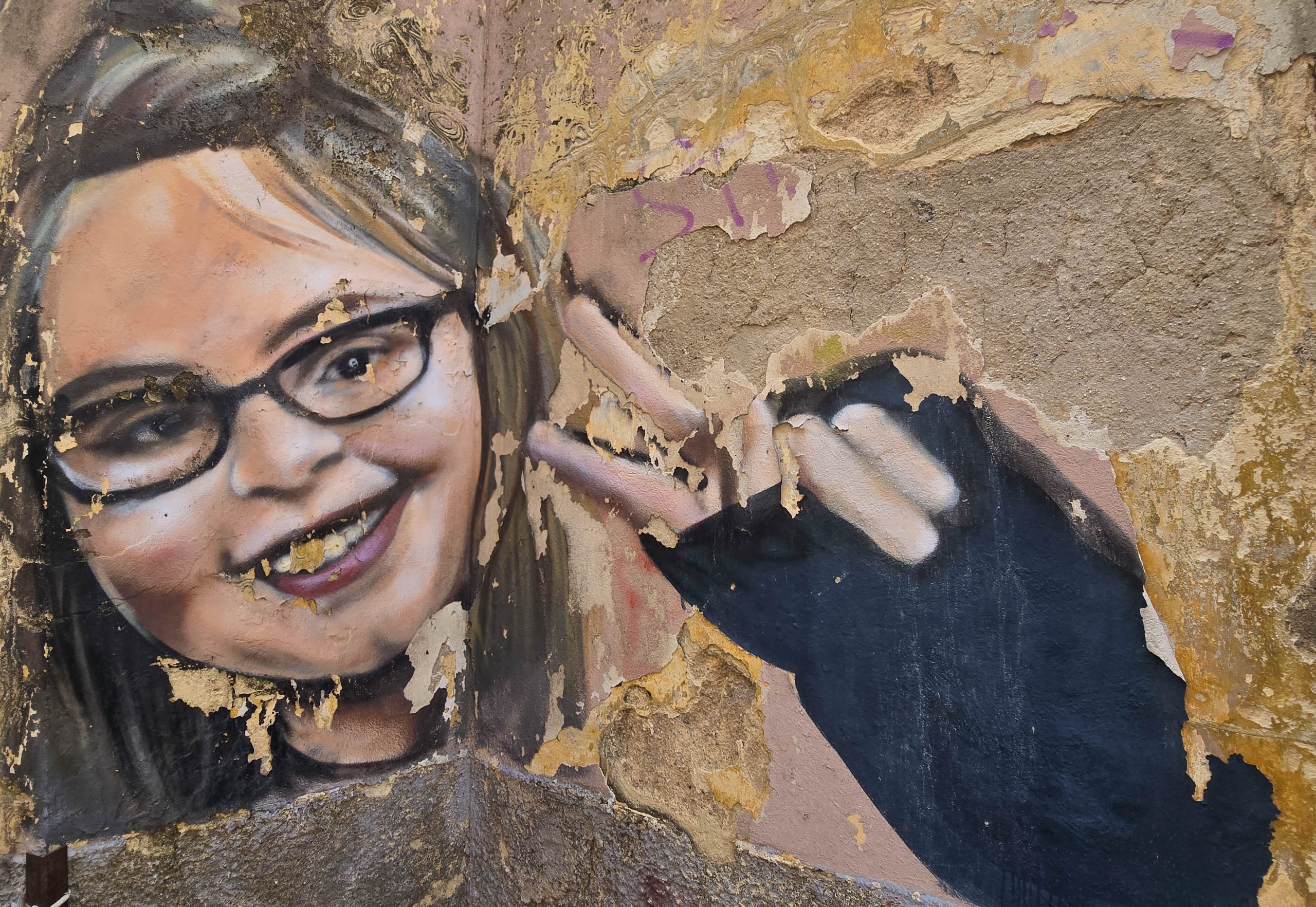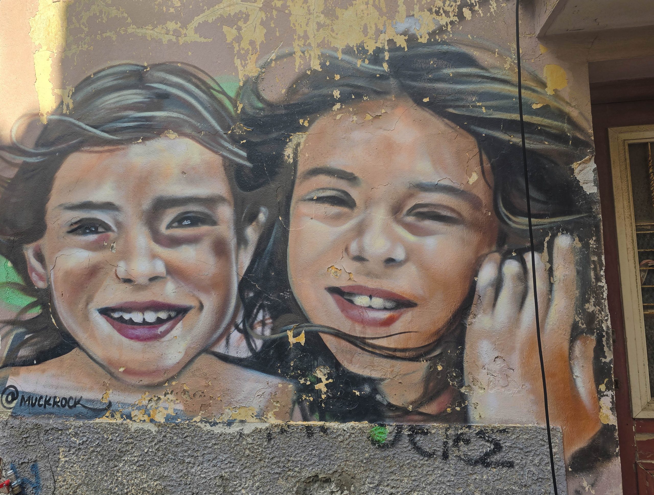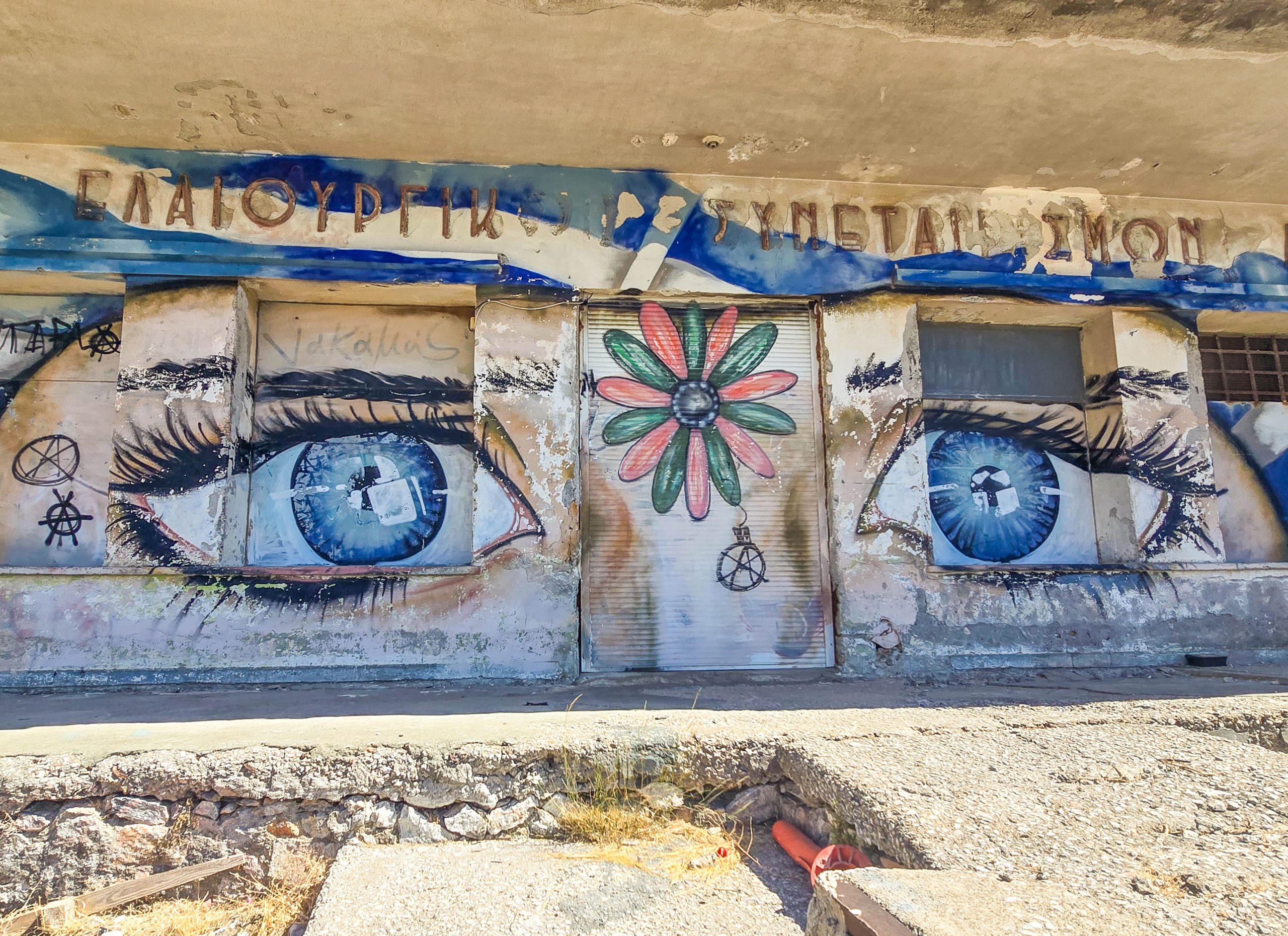 Back in Mytilene and its empty Sunday afternoon streets, I wandered through nooks and crannies once again, stumbling upon a small quarter I hadn’t discovered before, along with more examples of intriguing street art. There’s a noticeable and growing urban art presence in the town. Street art — graffiti, murals, call it what you will — tends to divide opinion. Personally, I love it, especially when it’s done well. It gives you a sense of a place and adds another layer, a visual shorthand for what matters. It’s also thought-provoking and unravelling the message behind the work is part of the fun.