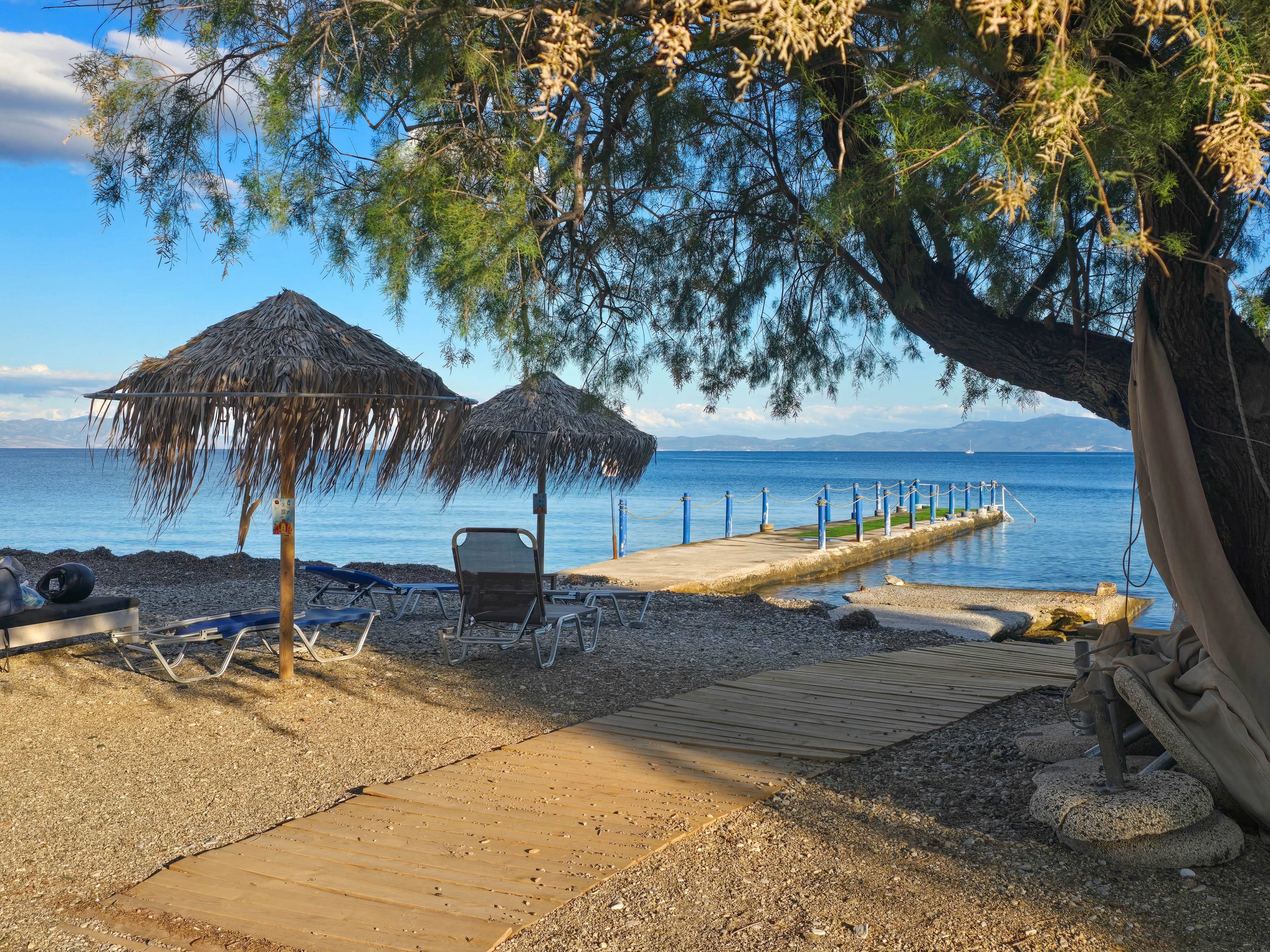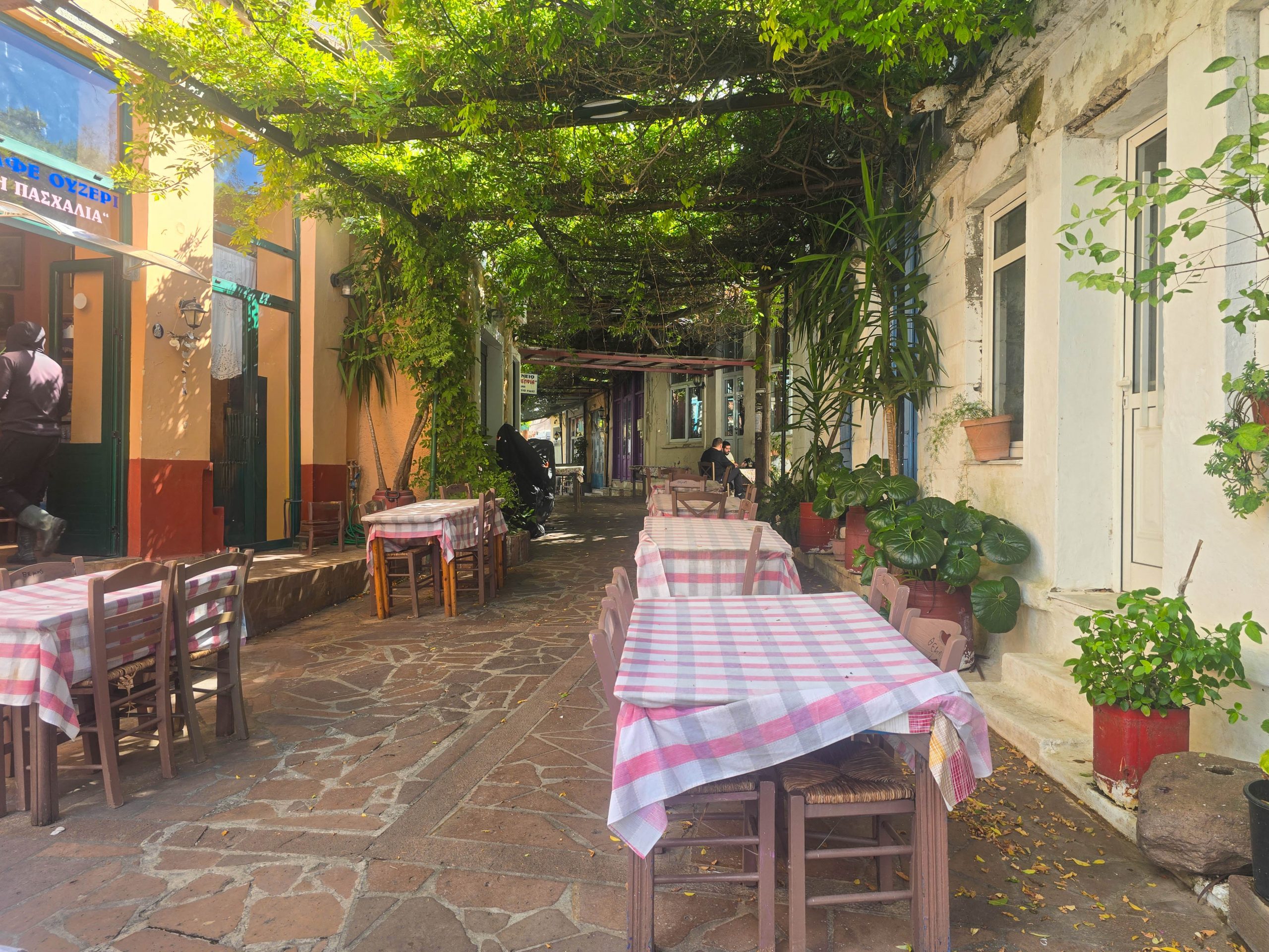 In the village square, a war memorial bears a quote by Kostis Palamas, and nearby railings, decorated with ribbons, hint at an upcoming wedding. Moving through the village, little gaps between houses opened up to reveal views down towards the bay. On a clear day like this, Turkey sat across the water in what looked like touching distance.