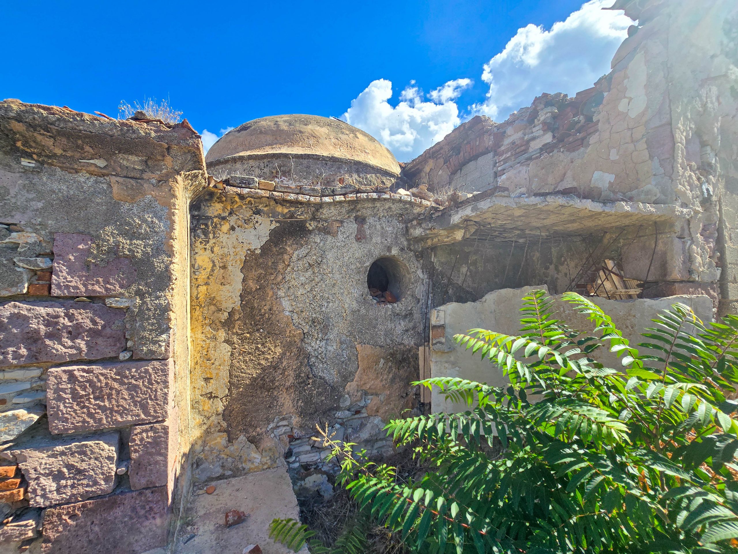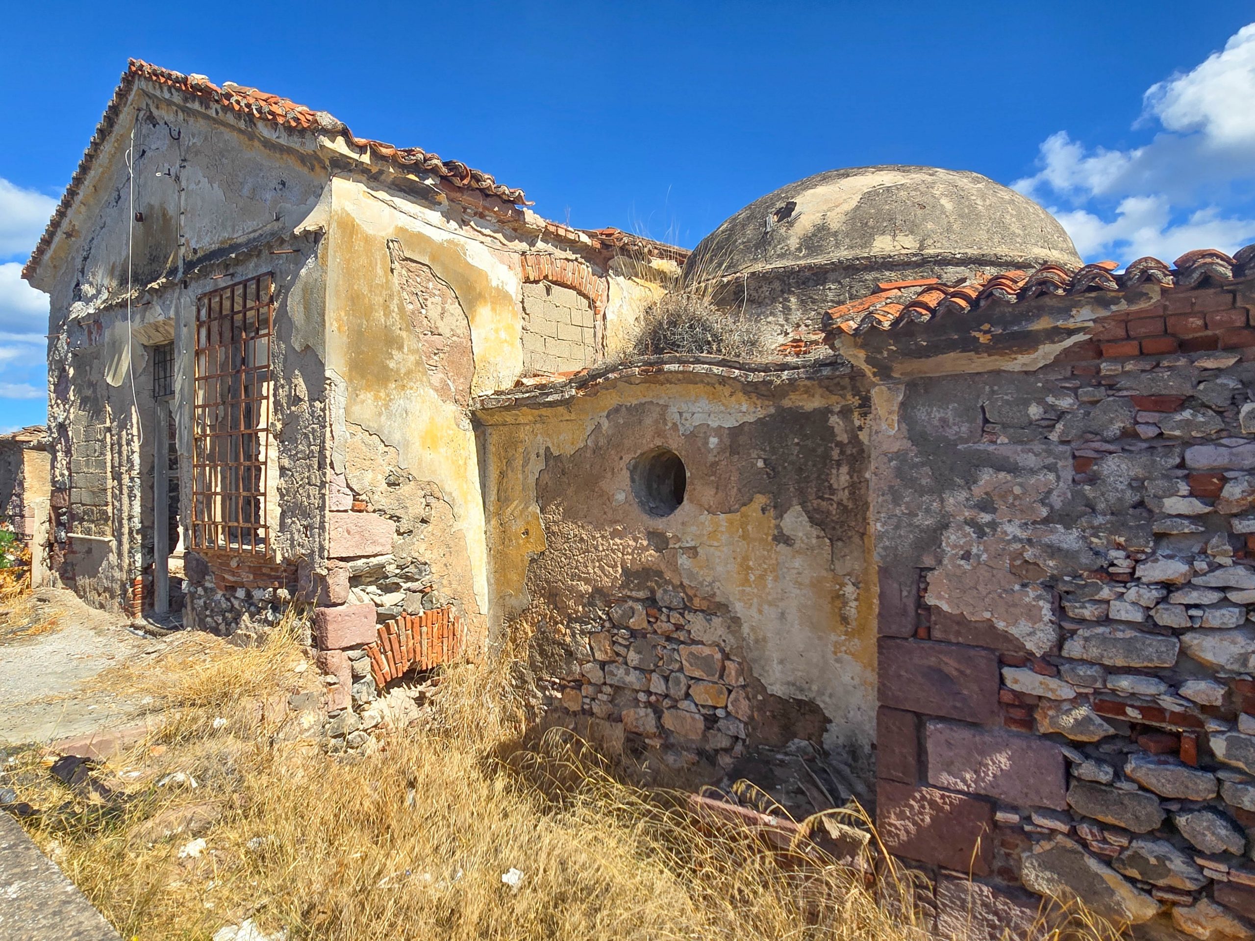 Further down, buildings in various stages of dereliction began to appear, and it was here that the “Thermi” in Loutropolis Thermis started to reveal itself. A small domed structure, roofed with pantiles, with steps leading down into an arched entrance, bore the unmistakable rusty staining of mineral-rich thermal water. I would have loved to have had a peep inside, but the standing water and the precarious state of the building kept me firmly on the periphery.