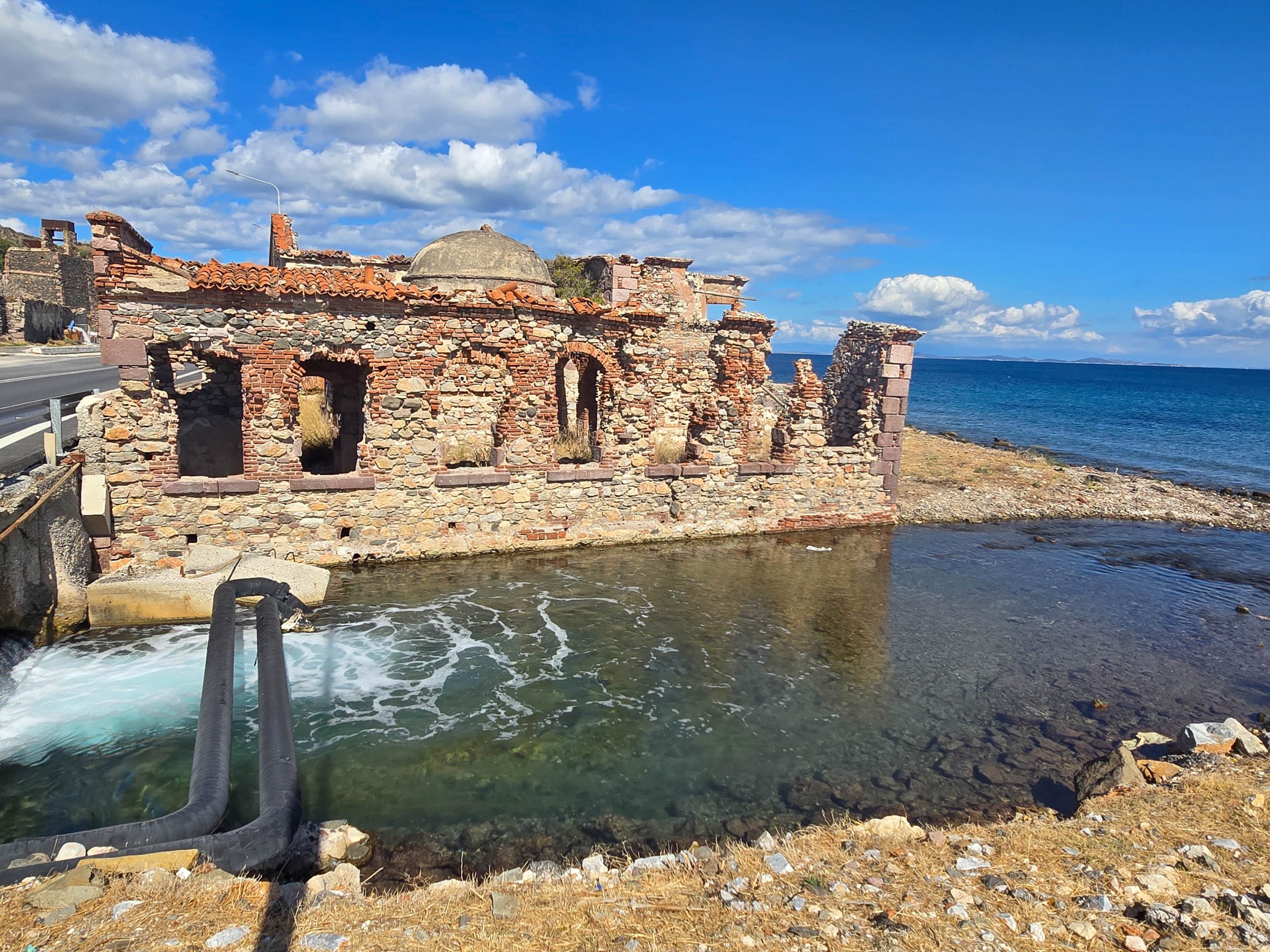 A waiting taxi solved the problem of the return journey, and as we drove back towards Mytilene, I asked the driver to drop me near an old, crumbling structure sitting right on the water’s edge. I had noticed it from the bus the previous day, derelict and unmarked on the map, but deeply evocative. There is something deeply moving and beautiful in the way history lingers in decay. It’s when the ghosts of lives that once moved through these spaces bring the place alive.